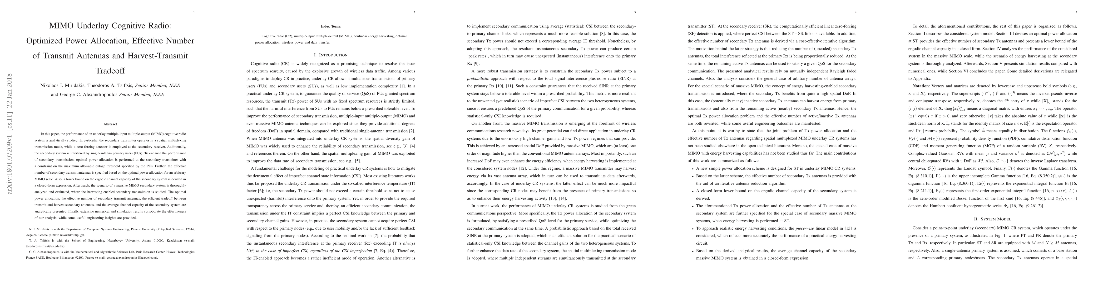 This paper analyzes the performance of an underlay MIMO cognitive radio system, optimizing power allocation and determining the effective number of secondary transmit antennas under interference from single-antenna primary users. It also explores the tradeoff between transmit and energy harvesting in massive MIMO systems, providing analytical insights and numerical validation.
