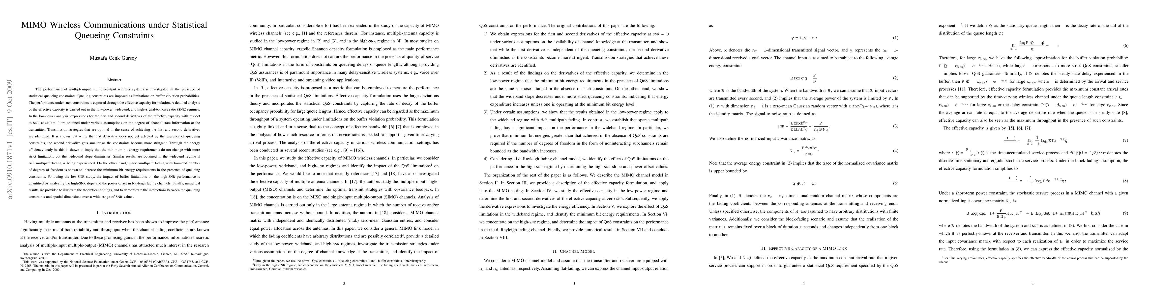 This paper investigates MIMO wireless systems' performance under statistical queueing constraints, analyzing effective capacity in low-power, wideband, and high-SNR regimes. It finds that while stringent queueing constraints do not affect the first derivative of effective capacity, they reduce the second derivative, leading to a diminished wideband slope and increased minimum bit energy requirements in sparse multipath fading scenarios.
