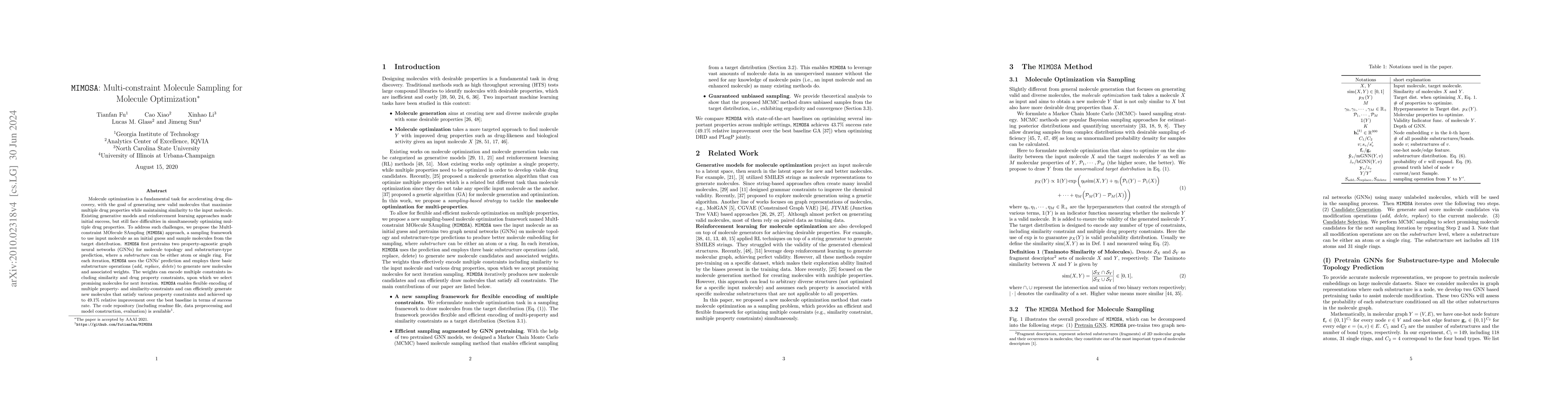 Molecule optimization is a fundamental task for accelerating drug discovery, with the goal of generating new valid molecules that maximize multiple drug properties while maintaining similarity to the input molecule. Existing generative models and reinforcement learning approaches made initial success, but still face difficulties in simultaneously optimizing multiple drug properties. To address such challenges, we propose the MultI-constraint MOlecule SAmpling (MIMOSA) approach, a sampling framework to use input molecule as an initial guess and sample molecules from the target distribution. MIMOSA first pretrains two property agnostic graph neural networks (GNNs) for molecule topology and substructure-type prediction, where a substructure can be either atom or single ring. For each iteration, MIMOSA uses the GNNs' prediction and employs three basic substructure operations (add, replace, delete) to generate new molecules and associated weights. The weights can encode multiple constraints including similarity and drug property constraints, upon which we select promising molecules for next iteration. MIMOSA enables flexible encoding of multiple property- and similarity-constraints and can efficiently generate new molecules that satisfy various property constraints and achieved up to 49.6% relative improvement over the best baseline in terms of success rate. The code repository (including readme file, data preprocessing and model construction, evaluation) is available https://github.com/futianfan/MIMOSA.