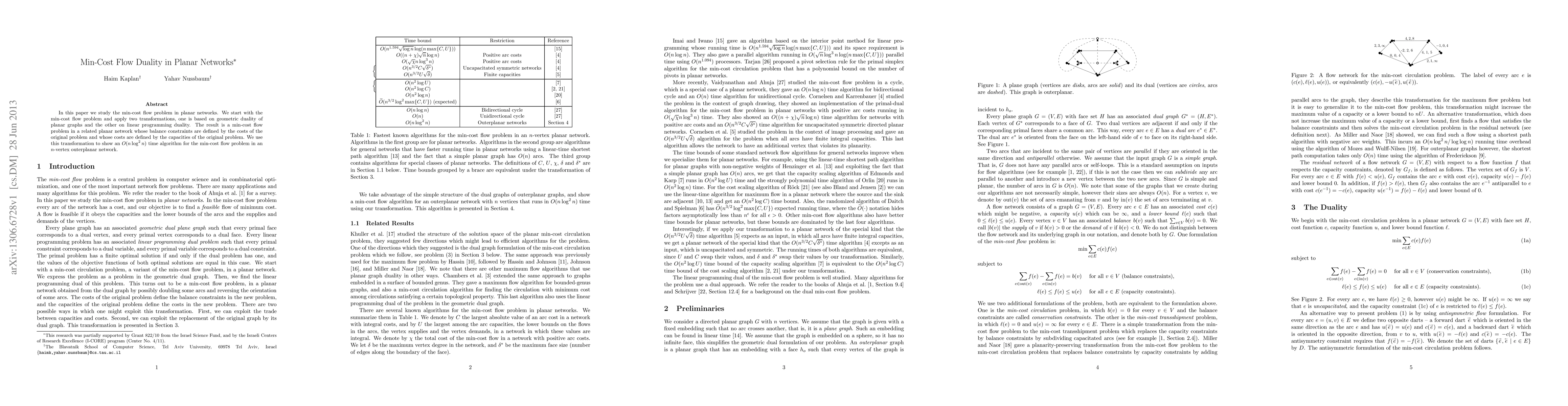 This paper explores the min-cost flow problem in planar networks through geometric and linear programming dualities, leading to a transformed problem that enables an O(n log^2 n) time algorithm for min-cost flow in n-vertex outerplanar networks.