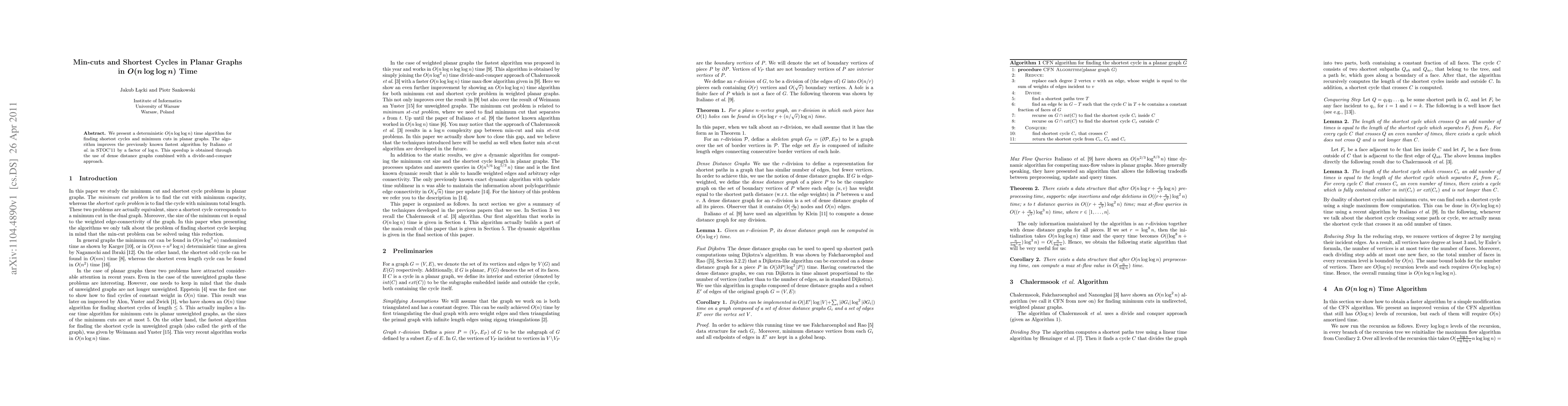 This paper introduces a deterministic O(n log log n) time algorithm for finding shortest cycles and minimum cuts in planar graphs, improving upon previous methods by a factor of log n through the use of dense distance graphs and a divide-and-conquer strategy.
