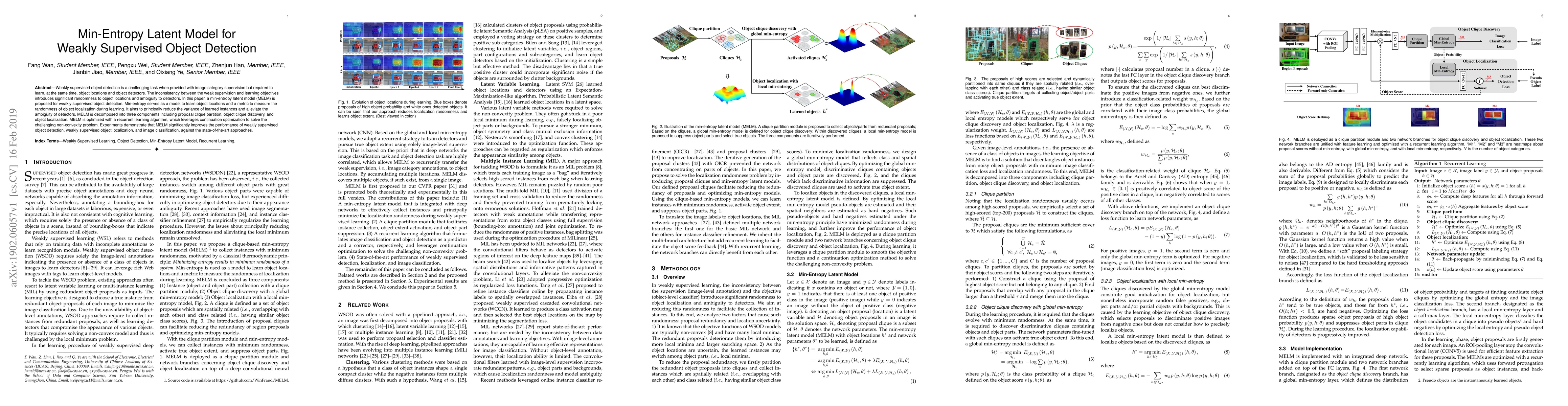 The paper proposes a min-entropy latent model (MELM) to tackle the challenges of weakly supervised object detection, combining proposal clique partition, object clique discovery, and localization. MELM optimizes learning through a recurrent algorithm, showing improved detection, localization, and classification performance compared to existing methods.