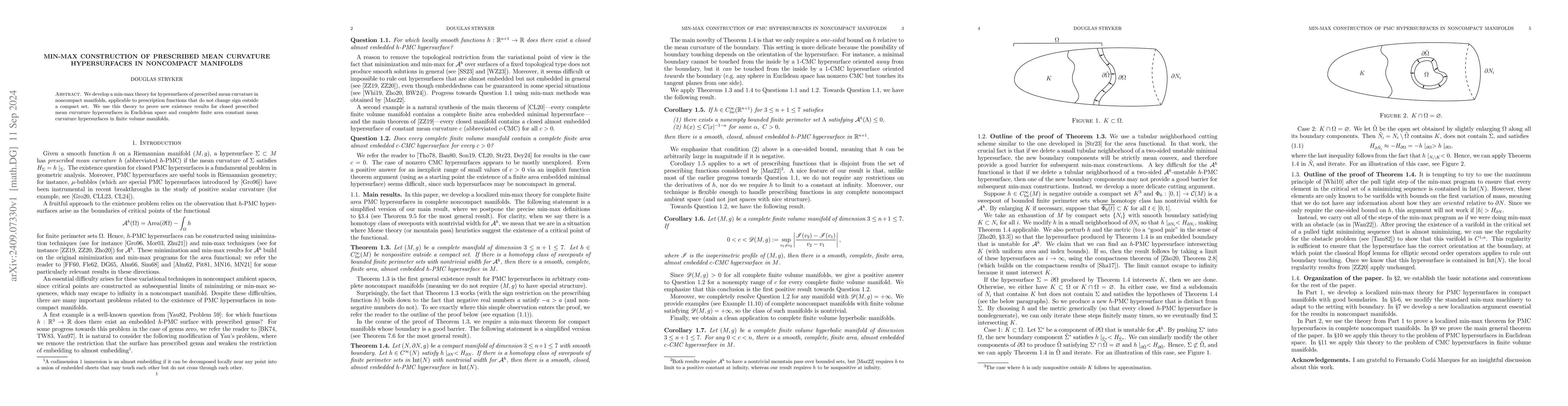 This paper establishes a min-max theory for hypersurfaces with prescribed mean curvature in noncompact manifolds, proving new existence results for closed hypersurfaces in Euclidean space and finite area constant mean curvature hypersurfaces in finite volume manifolds. The theory applies to prescription functions that remain non-negative outside a compact region.