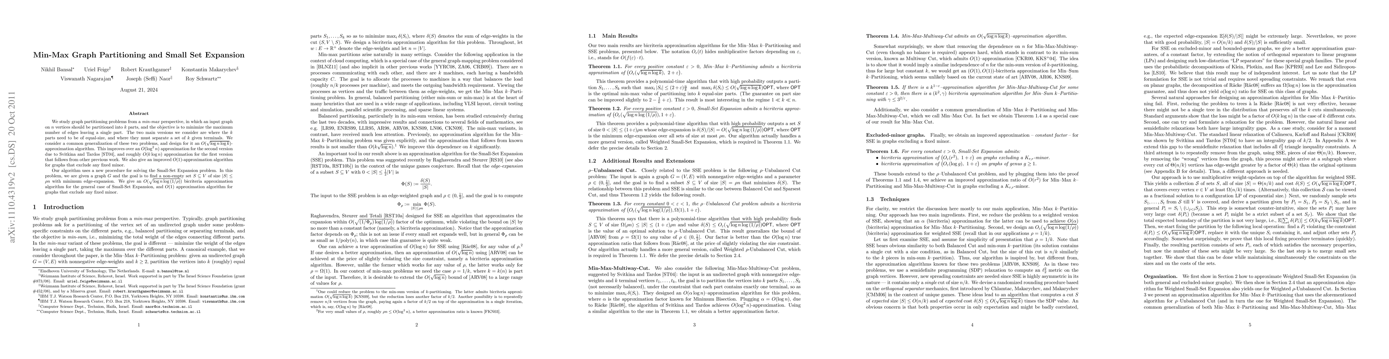 This paper presents an $O(\sqrt{\log n \log k})$-approximation algorithm for the min-max graph partitioning problem, improving previous approximations. It also introduces an $O(\sqrt{\log n \log (1/\rho)})$ bicriteria approximation for the Small-Set Expansion problem, with an O(1) approximation for graphs excluding any fixed minor.