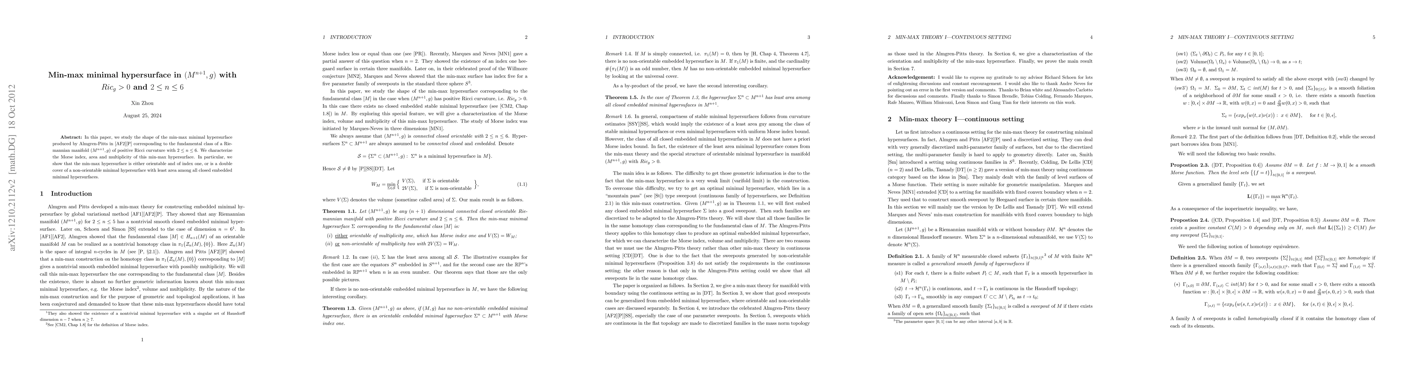 In this paper, we study the shape of the min-max minimal hypersurface produced by Almgren-Pitts in \cite{A2}\cite{P} corresponding to the fundamental class of a Riemannian manifold $(M^{n+1}, g)$ of positive Ricci curvature with $2\leq n\leq 6$. We characterize the Morse index, area and multiplicity of this min-max hypersurface. In particular, we show that the min-max hypersurface is either orientable and of index one, or is a double cover of a non-orientable minimal hypersurface with least area among all closed embedded minimal hypersurfaces.