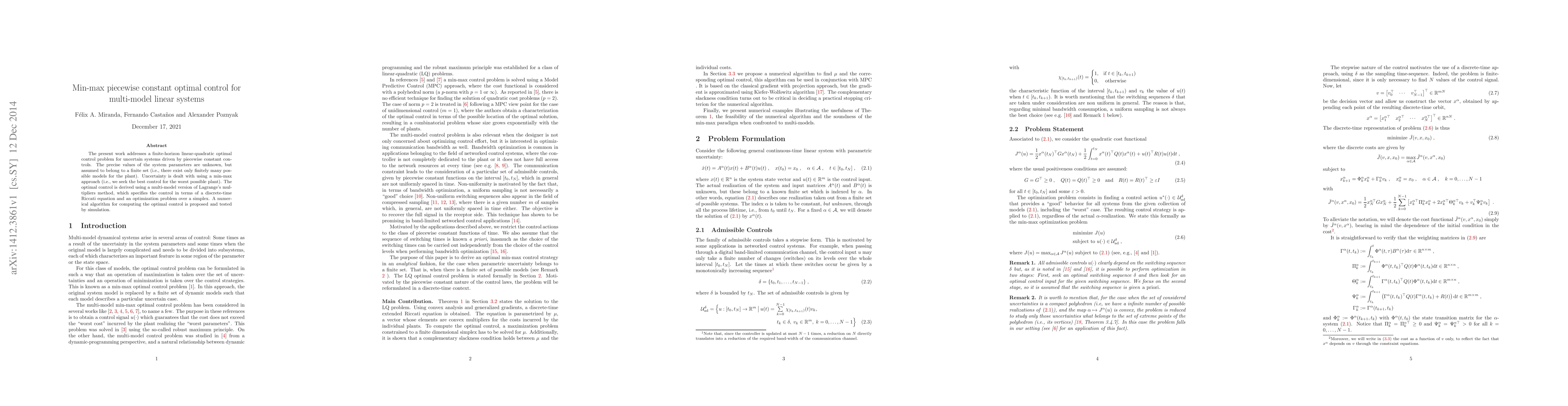 This paper develops a min-max optimal control strategy for uncertain multi-model linear systems with piecewise constant controls, using a multi-model version of Lagrange's multipliers. The approach finds the best control for the worst-case scenario and is tested via a numerical algorithm.