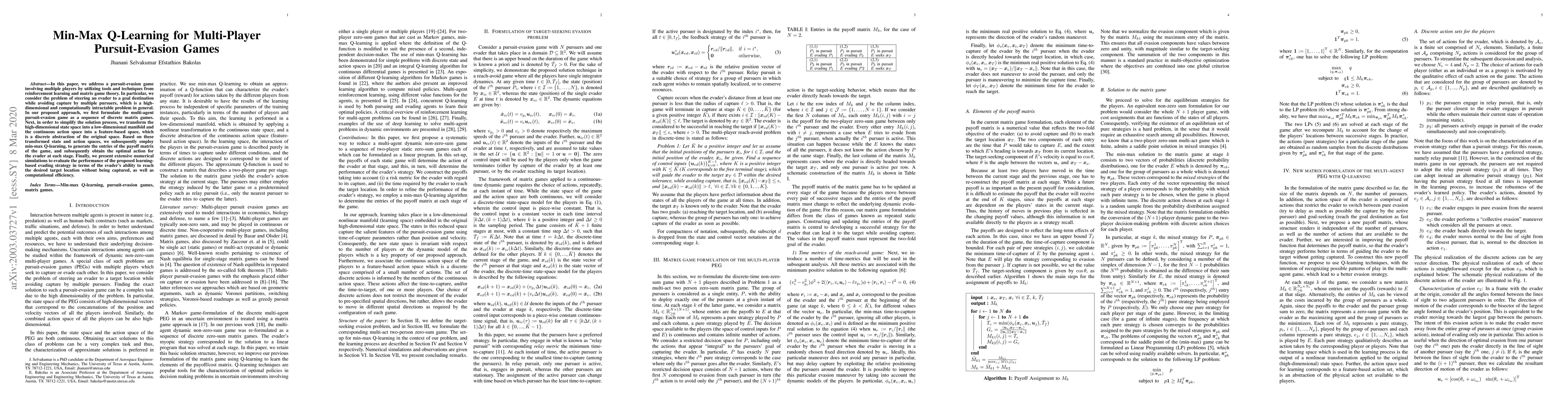 In this paper, we address a pursuit-evasion game involving multiple players by utilizing tools and techniques from reinforcement learning and matrix game theory. In particular, we consider the problem of steering an evader to a goal destination while avoiding capture by multiple pursuers, which is a high-dimensional and computationally intractable problem in general. In our proposed approach, we first formulate the multi-agent pursuit-evasion game as a sequence of discrete matrix games. Next, in order to simplify the solution process, we transform the high-dimensional state space into a low-dimensional manifold and the continuous action space into a feature-based space, which is a discrete abstraction of the original space. Based on these transformed state and action spaces, we subsequently employ min-max Q-learning, to generate the entries of the payoff matrix of the game, and subsequently obtain the optimal action for the evader at each stage. Finally, we present extensive numerical simulations to evaluate the performance of the proposed learning-based evading strategy in terms of the evader's ability to reach the desired target location without being captured, as well as computational efficiency.