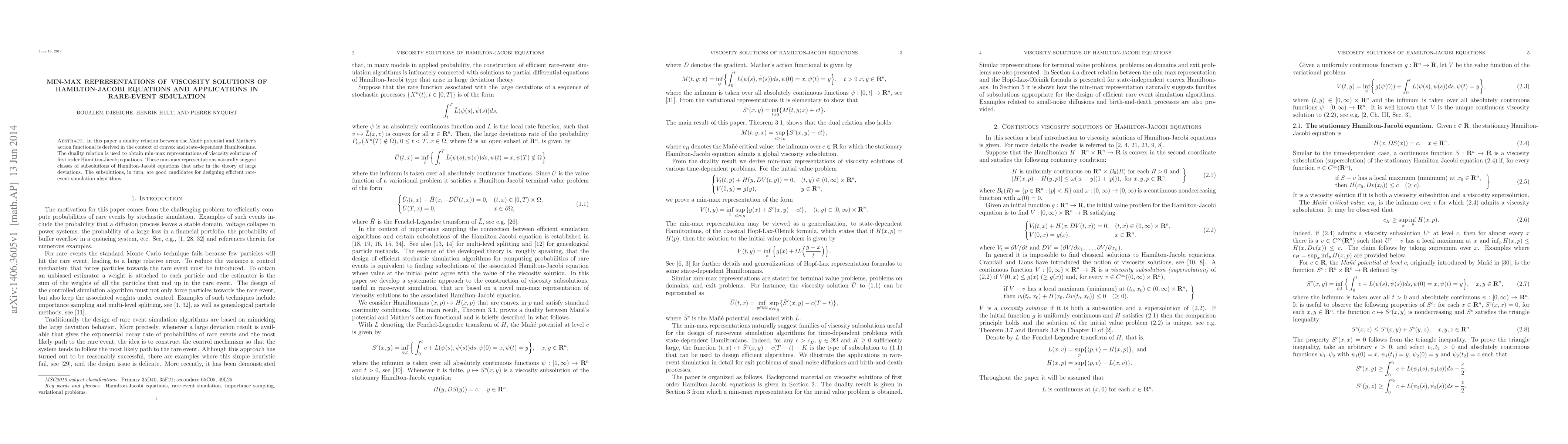 This paper establishes a duality between the Maně potential and Mather's action functional for convex and state-dependent Hamiltonians, leading to min-max representations of viscosity solutions of Hamilton-Jacobi equations. These representations are applied to develop efficient rare-event simulation algorithms.