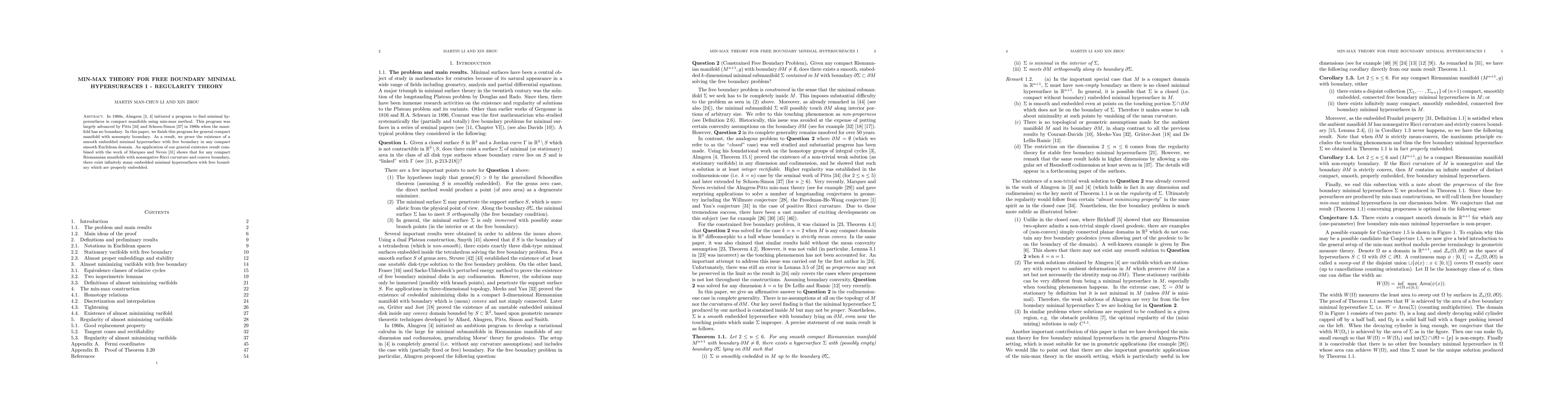 The development of a min-max theory for free boundary minimal hypersurfaces in general compact manifolds, including detailed regularity theory.
