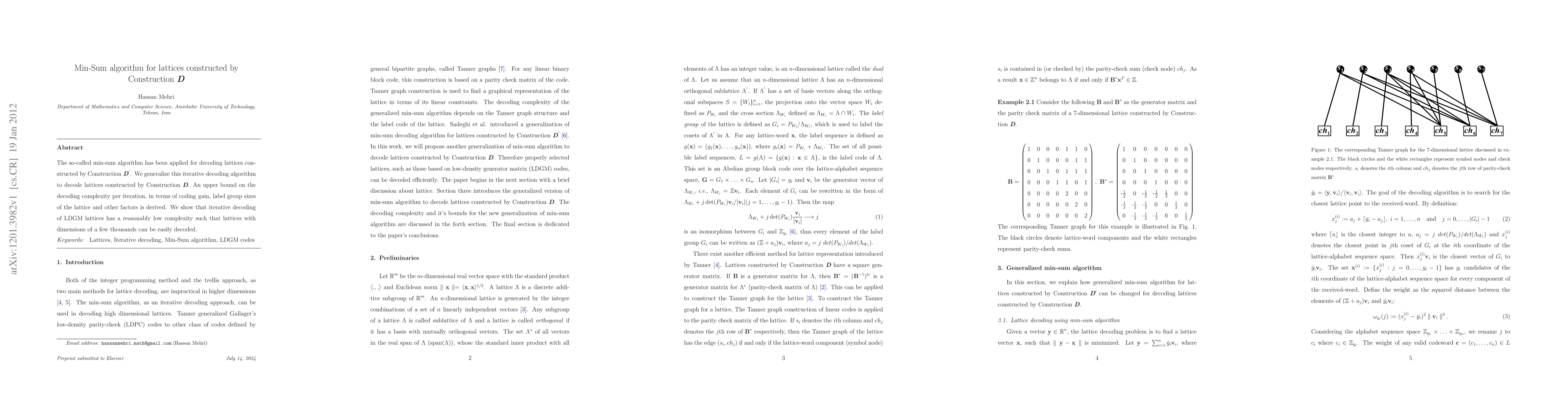 The paper generalizes the min-sum algorithm for decoding lattices constructed by Construction D, deriving an upper bound on decoding complexity and demonstrating its applicability to large lattices with dimensions up to a few thousands.