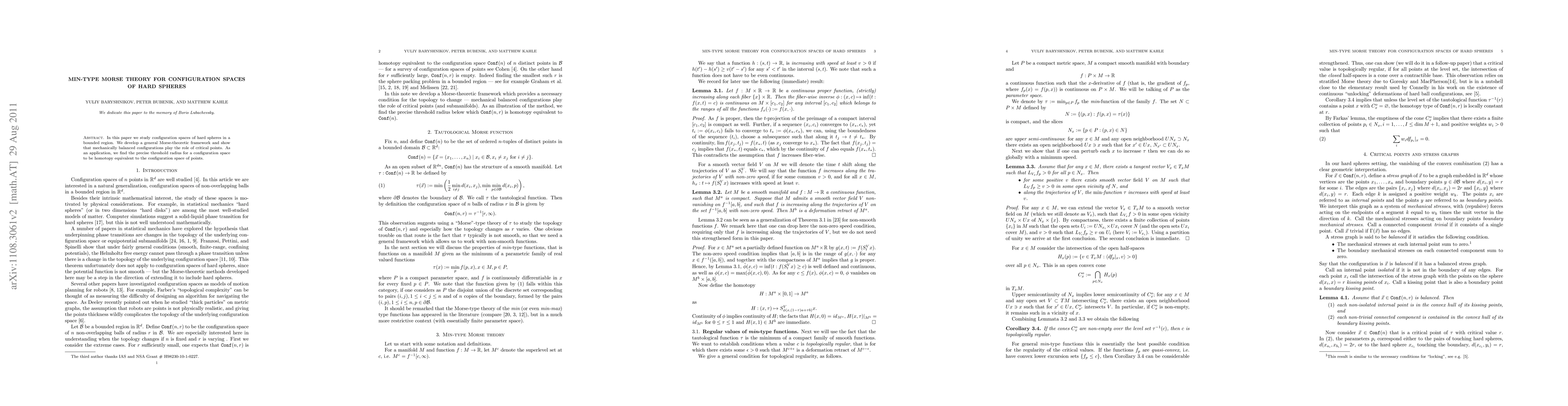 This paper develops a Morse-theoretic framework for configuration spaces of hard spheres, identifying mechanically balanced configurations as critical points, and determines the precise threshold radius for these spaces to be homotopy equivalent to configuration spaces of points.