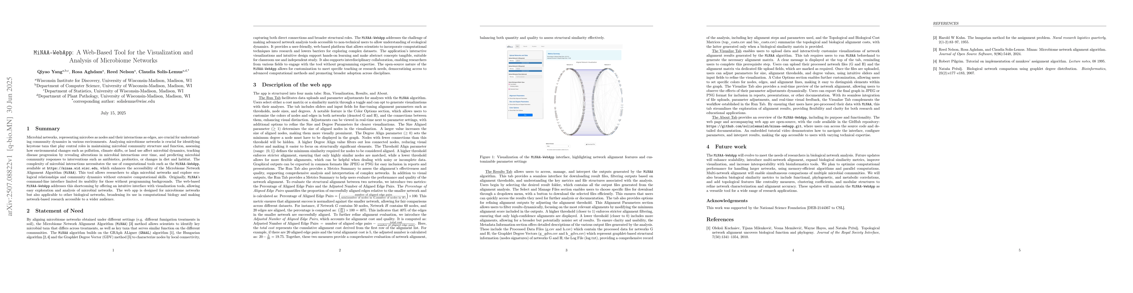 The novelty of this work lies in its democratization of advanced network analysis tools, making them accessible to a broader audience in computational biology. The MiNAA-WebApp's interactive visualizations, customizable parameters, and comprehensive evaluation metrics distinguish it from existing research tools.