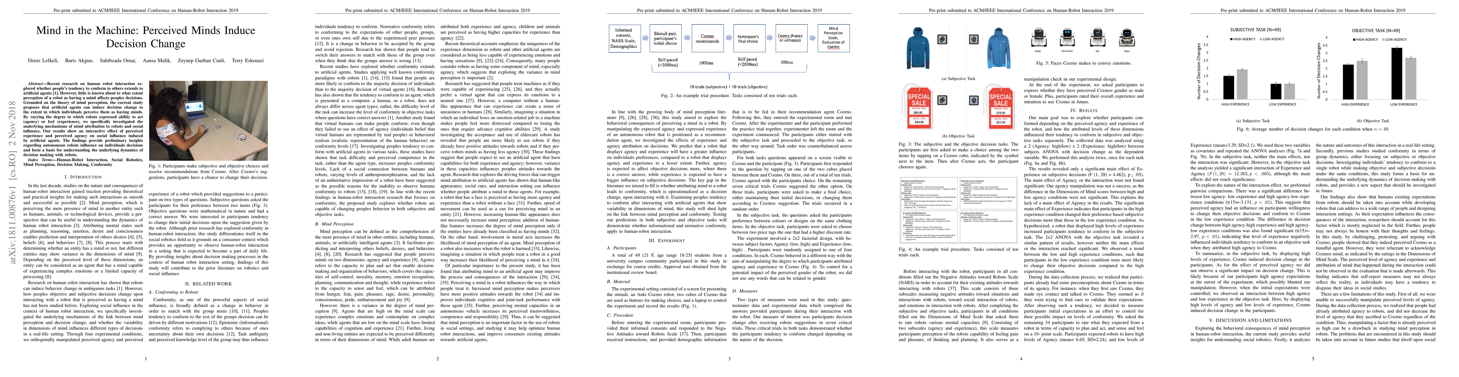 Recent research on human robot interaction explored whether people's tendency to conform to others extends to artificial agents (Hertz & Wiese, 2016). However, little is known about to what extent perception of a robot as having a mind affects people's decisions. Grounded on the theory of mind perception, the current study proposes that artificial agents can induce decision change to the extent in which individuals perceive them as having minds. By varying the degree to which robots expressed ability to act (agency) or feel (experience), we specifically investigated the underlying mechanisms of mind attribution to robots and social influence. Our results show an interactive effect of perceived experience and perceived agency on social influence induced by artificial agents. The findings provide preliminary insights regarding autonomous robots' influence on individuals' decisions and form a basis for understanding the underlying dynamics of decision making with robots.