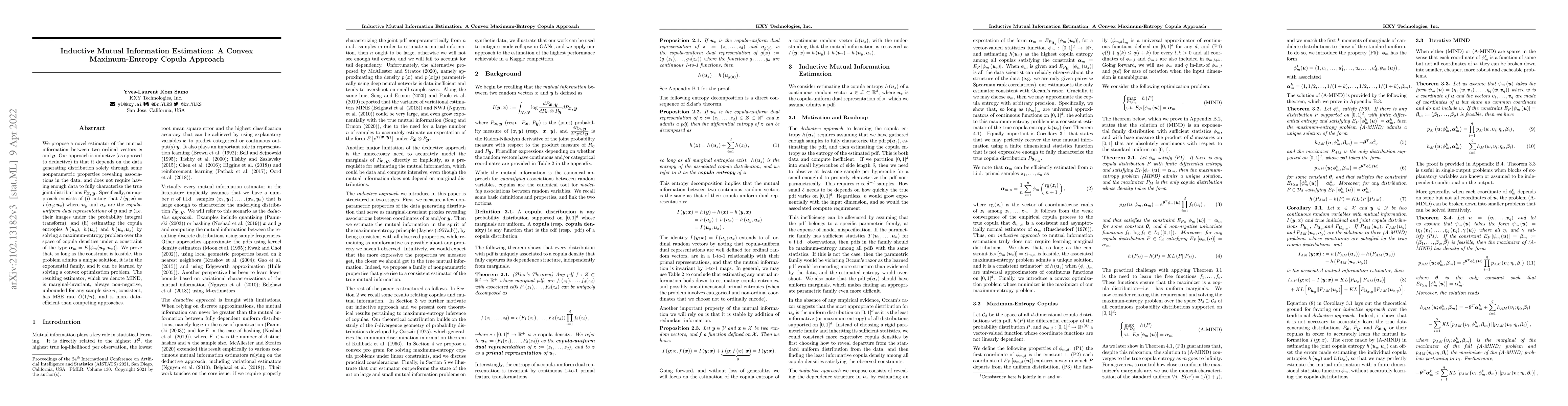 The paper introduces MIND, an inductive mutual information estimator based on a convex maximum-entropy copula approach, providing a unique solution in the exponential family and a convex optimization problem for learning.