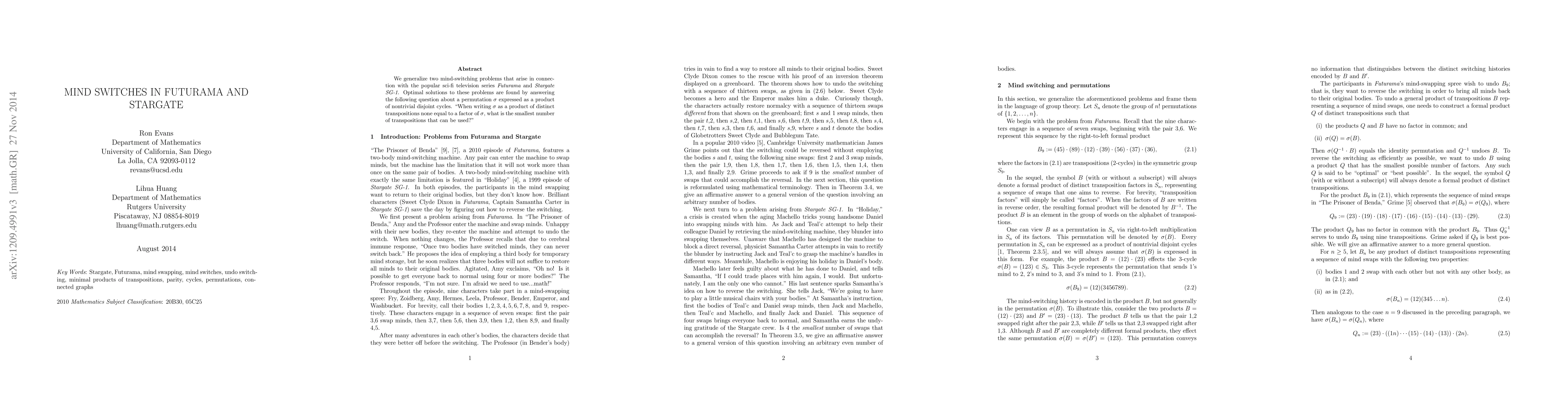 The paper presents a mathematical analysis of mind-switching problems, specifically focusing on reversing sequences of swaps in the context of popular sci-fi series Futurama and Stargate SG-1, using permutation theory and graph theory.