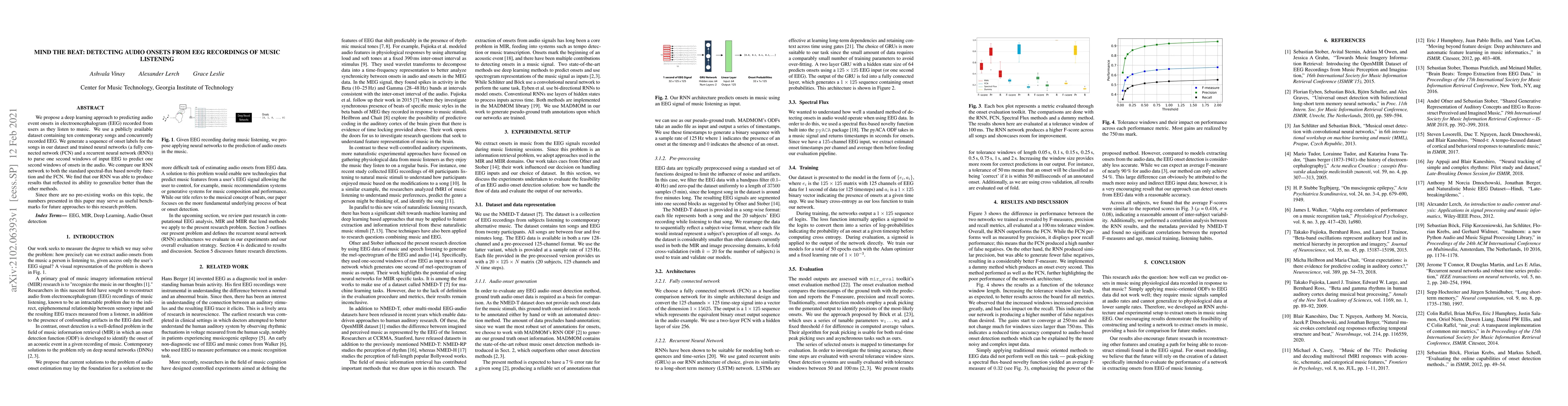 This paper proposes a deep learning method to predict audio event onsets from EEG recordings of music listening using neural networks. The RNN model outperformed both a fully connected network and a spectral-flux based method, demonstrating better generalization. The results provide benchmarks for future research on detecting audio onsets from EEG.