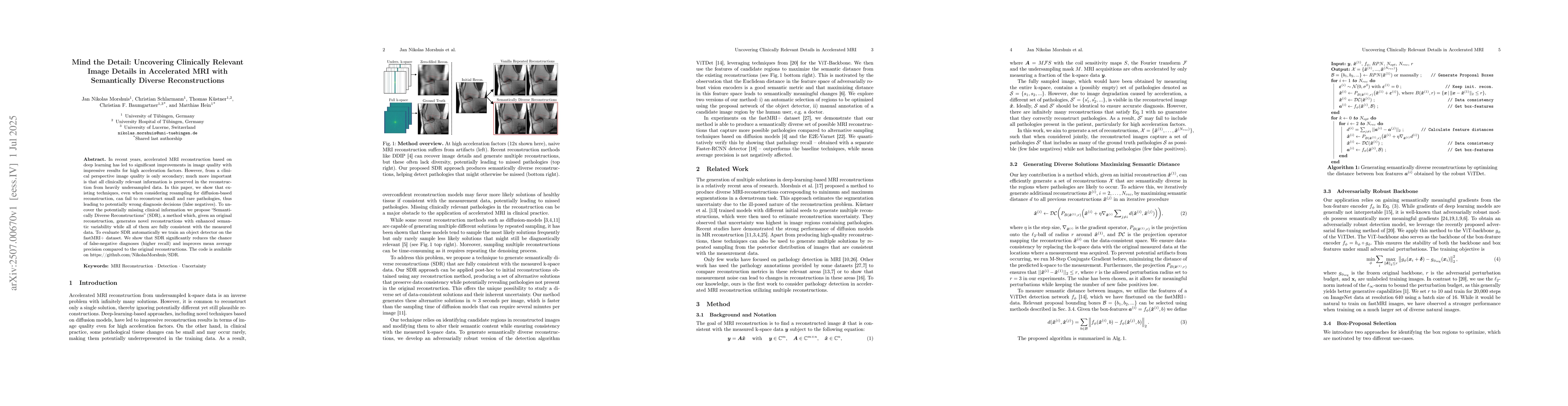 In recent years, accelerated MRI reconstruction based on deep learning has led to significant improvements in image quality with impressive results for high acceleration factors. However, from a clinical perspective image quality is only secondary; much more important is that all clinically relevant information is preserved in the reconstruction from heavily undersampled data. In this paper, we show that existing techniques, even when considering resampling for diffusion-based reconstruction, can fail to reconstruct small and rare pathologies, thus leading to potentially wrong diagnosis decisions (false negatives). To uncover the potentially missing clinical information we propose ``Semantically Diverse Reconstructions'' (\SDR), a method which, given an original reconstruction, generates novel reconstructions with enhanced semantic variability while all of them are fully consistent with the measured data. To evaluate \SDR automatically we train an object detector on the fastMRI+ dataset. We show that \SDR significantly reduces the chance of false-negative diagnoses (higher recall) and improves mean average precision compared to the original reconstructions. The code is available on https://github.com/NikolasMorshuis/SDR
