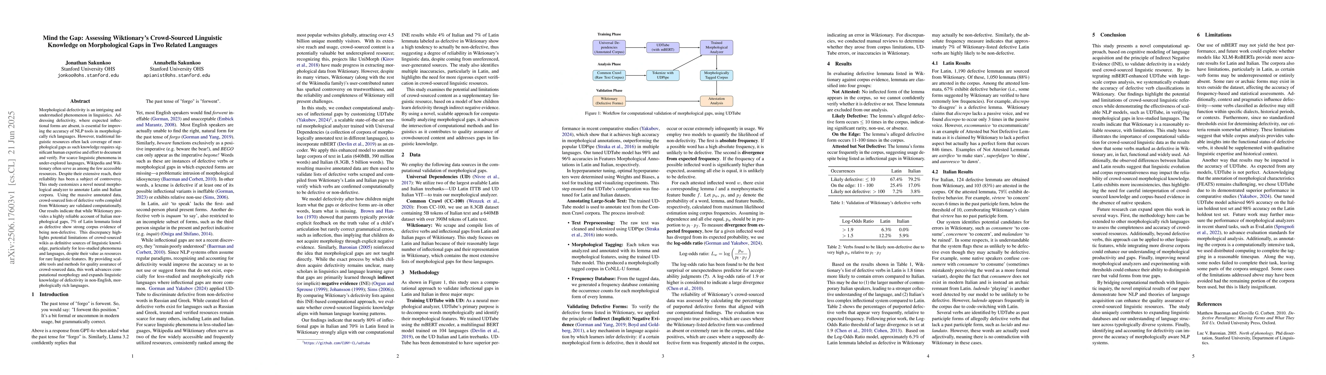 Morphological defectivity is an intriguing and understudied phenomenon in linguistics. Addressing defectivity, where expected inflectional forms are absent, is essential for improving the accuracy of NLP tools in morphologically rich languages. However, traditional linguistic resources often lack coverage of morphological gaps as such knowledge requires significant human expertise and effort to document and verify. For scarce linguistic phenomena in under-explored languages, Wikipedia and Wiktionary often serve as among the few accessible resources. Despite their extensive reach, their reliability has been a subject of controversy. This study customizes a novel neural morphological analyzer to annotate Latin and Italian corpora. Using the massive annotated data, crowd-sourced lists of defective verbs compiled from Wiktionary are validated computationally. Our results indicate that while Wiktionary provides a highly reliable account of Italian morphological gaps, 7% of Latin lemmata listed as defective show strong corpus evidence of being non-defective. This discrepancy highlights potential limitations of crowd-sourced wikis as definitive sources of linguistic knowledge, particularly for less-studied phenomena and languages, despite their value as resources for rare linguistic features. By providing scalable tools and methods for quality assurance of crowd-sourced data, this work advances computational morphology and expands linguistic knowledge of defectivity in non-English, morphologically rich languages.