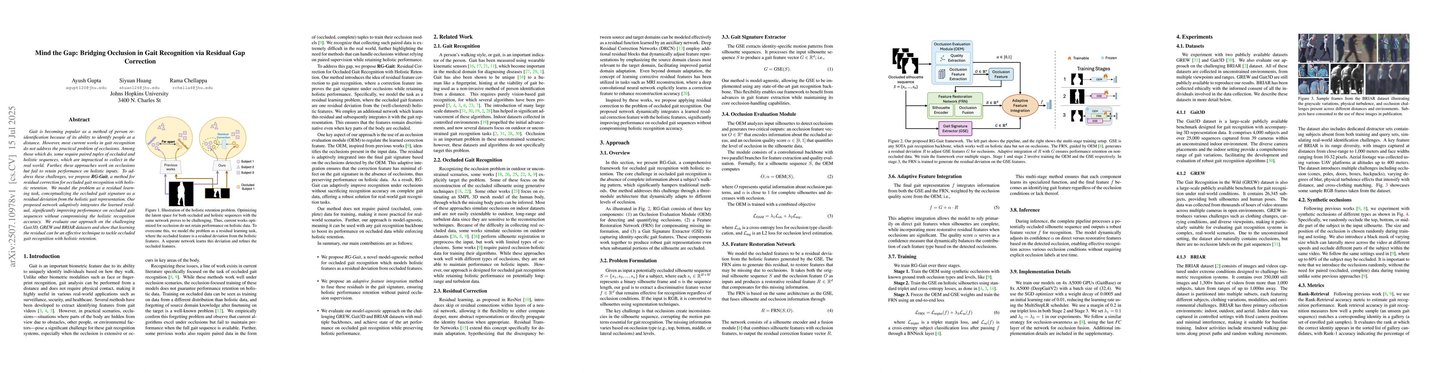 Gait is becoming popular as a method of person re-identification because of its ability to identify people at a distance. However, most current works in gait recognition do not address the practical problem of occlusions. Among those which do, some require paired tuples of occluded and holistic sequences, which are impractical to collect in the real world. Further, these approaches work on occlusions but fail to retain performance on holistic inputs. To address these challenges, we propose RG-Gait, a method for residual correction for occluded gait recognition with holistic retention. We model the problem as a residual learning task, conceptualizing the occluded gait signature as a residual deviation from the holistic gait representation. Our proposed network adaptively integrates the learned residual, significantly improving performance on occluded gait sequences without compromising the holistic recognition accuracy. We evaluate our approach on the challenging Gait3D, GREW and BRIAR datasets and show that learning the residual can be an effective technique to tackle occluded gait recognition with holistic retention.