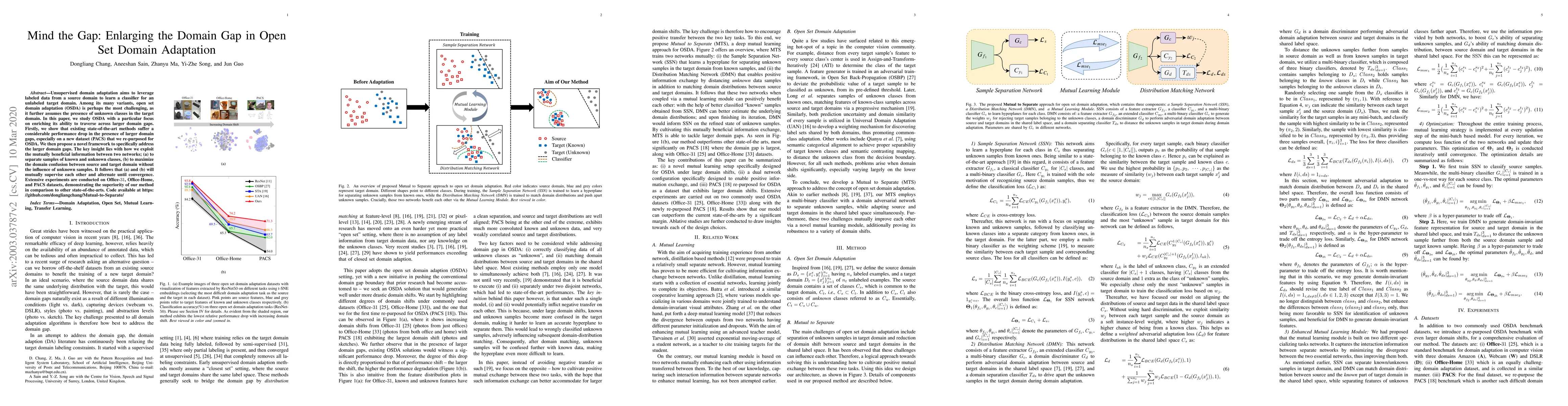 Unsupervised domain adaptation aims to leverage labeled data from a source domain to learn a classifier for an unlabeled target domain. Among its many variants, open set domain adaptation (OSDA) is perhaps the most challenging, as it further assumes the presence of unknown classes in the target domain. In this paper, we study OSDA with a particular focus on enriching its ability to traverse across larger domain gaps. Firstly, we show that existing state-of-the-art methods suffer a considerable performance drop in the presence of larger domain gaps, especially on a new dataset (PACS) that we re-purposed for OSDA. We then propose a novel framework to specifically address the larger domain gaps. The key insight lies with how we exploit the mutually beneficial information between two networks; (a) to separate samples of known and unknown classes, (b) to maximize the domain confusion between source and target domain without the influence of unknown samples. It follows that (a) and (b) will mutually supervise each other and alternate until convergence. Extensive experiments are conducted on Office-31, Office-Home, and PACS datasets, demonstrating the superiority of our method in comparison to other state-of-the-arts. Code available at https://github.com/dongliangchang/Mutual-to-Separate/