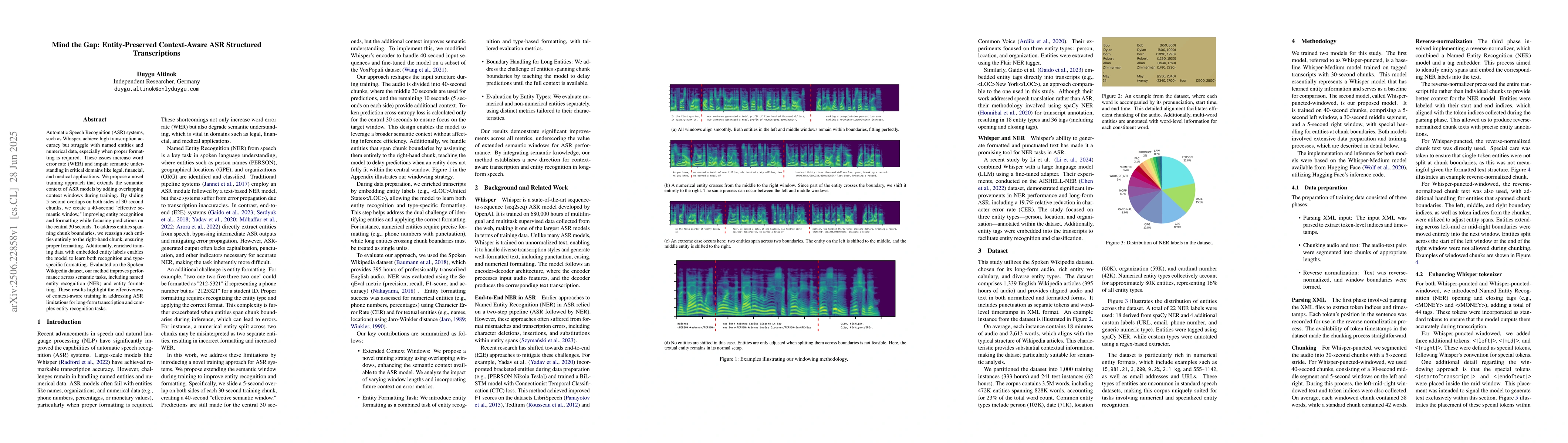 Automatic Speech Recognition (ASR) systems, such as Whisper, achieve high transcription accuracy but struggle with named entities and numerical data, especially when proper formatting is required. These issues increase word error rate (WER) and impair semantic understanding in critical domains like legal, financial, and medical applications. We propose a novel training approach that extends the semantic context of ASR models by adding overlapping context windows during training. By sliding 5-second overlaps on both sides of 30-second chunks, we create a 40-second "effective semantic window," improving entity recognition and formatting while focusing predictions on the central 30 seconds. To address entities spanning chunk boundaries, we reassign such entities entirely to the right-hand chunk, ensuring proper formatting. Additionally, enriched training data with embedded entity labels enables the model to learn both recognition and type-specific formatting. Evaluated on the Spoken Wikipedia dataset, our method improves performance across semantic tasks, including named entity recognition (NER) and entity formatting. These results highlight the effectiveness of context-aware training in addressing ASR limitations for long-form transcription and complex entity recognition tasks.