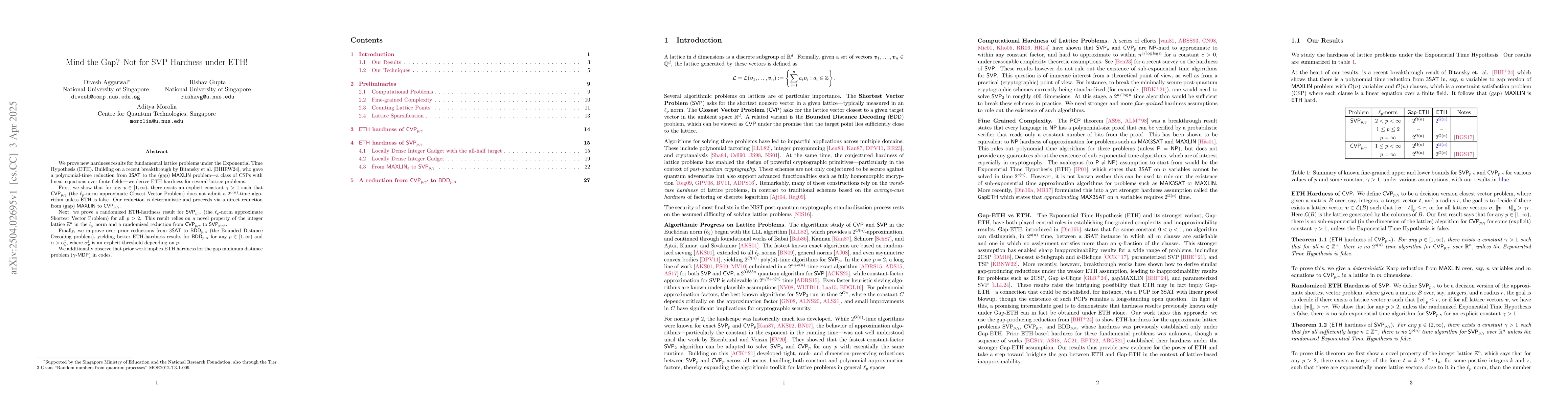 This work contributes to understanding the hardness of lattice problems under the ETH, which has implications for cryptography and complexity theory.