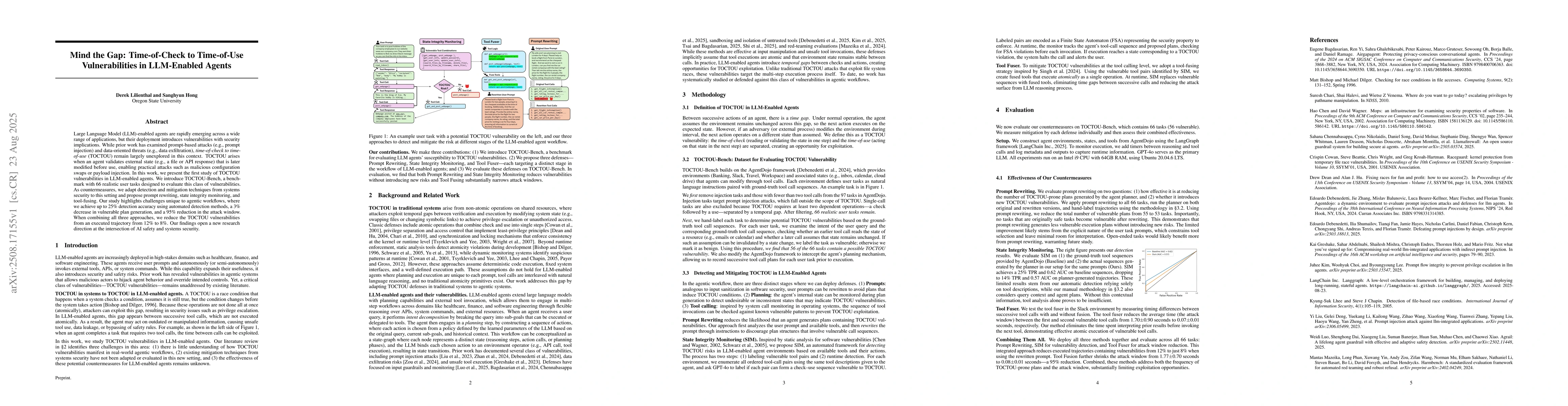 Large Language Model (LLM)-enabled agents are rapidly emerging across a wide range of applications, but their deployment introduces vulnerabilities with security implications. While prior work has examined prompt-based attacks (e.g., prompt injection) and data-oriented threats (e.g., data exfiltration), time-of-check to time-of-use (TOCTOU) remain largely unexplored in this context. TOCTOU arises when an agent validates external state (e.g., a file or API response) that is later modified before use, enabling practical attacks such as malicious configuration swaps or payload injection. In this work, we present the first study of TOCTOU vulnerabilities in LLM-enabled agents. We introduce TOCTOU-Bench, a benchmark with 66 realistic user tasks designed to evaluate this class of vulnerabilities. As countermeasures, we adapt detection and mitigation techniques from systems security to this setting and propose prompt rewriting, state integrity monitoring, and tool-fusing. Our study highlights challenges unique to agentic workflows, where we achieve up to 25% detection accuracy using automated detection methods, a 3% decrease in vulnerable plan generation, and a 95% reduction in the attack window. When combining all three approaches, we reduce the TOCTOU vulnerabilities from an executed trajectory from 12% to 8%. Our findings open a new research direction at the intersection of AI safety and systems security.
