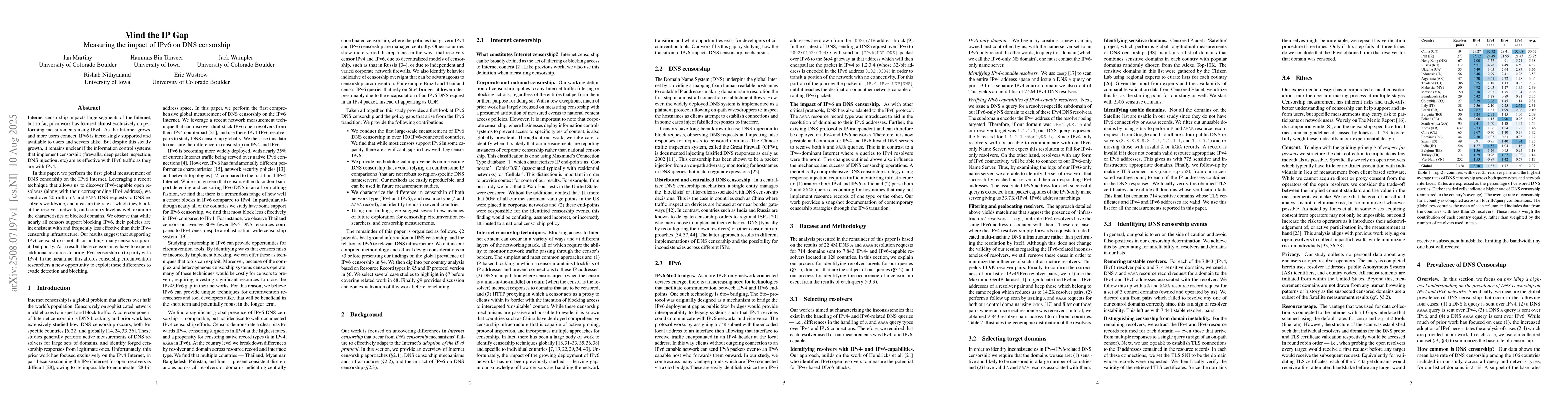 The paper performs the first global measurement of DNS censorship on the IPv6 Internet, leveraging a technique to discover IPv6-capable open resolvers and sending over 20 million A and AAAA DNS requests worldwide.