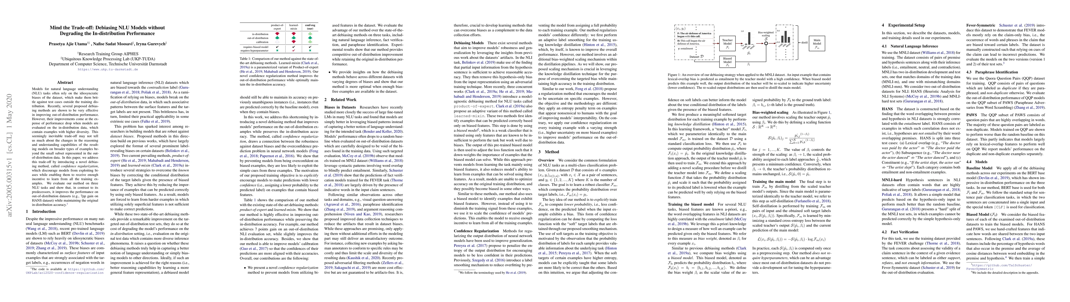 This paper introduces a novel debiasing method called confidence regularization to improve out-of-distribution performance of NLU models without sacrificing in-distribution accuracy, demonstrating a 7pp gain on the HANS dataset while maintaining original performance.