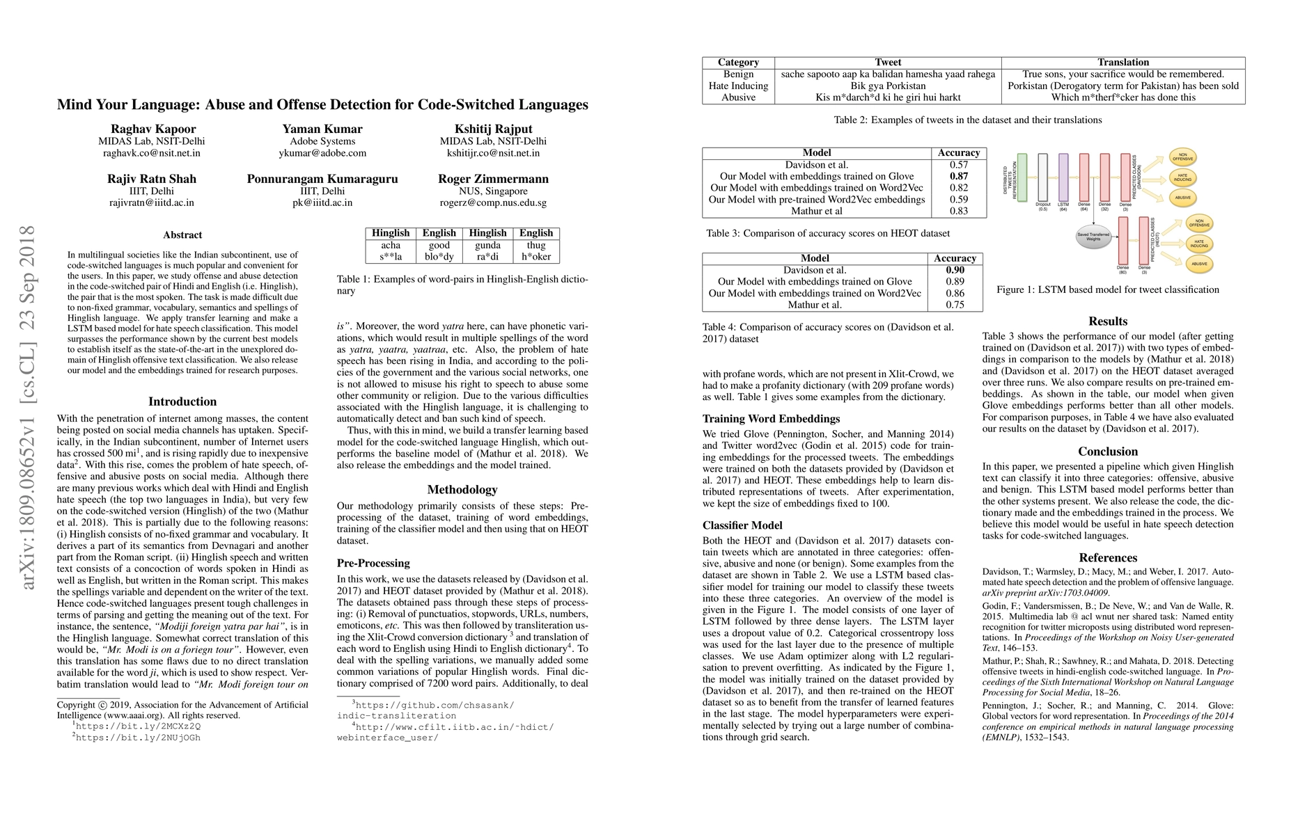 In multilingual societies like the Indian subcontinent, use of code-switched languages is much popular and convenient for the users. In this paper, we study offense and abuse detection in the code-switched pair of Hindi and English (i.e. Hinglish), the pair that is the most spoken. The task is made difficult due to non-fixed grammar, vocabulary, semantics and spellings of Hinglish language. We apply transfer learning and make a LSTM based model for hate speech classification. This model surpasses the performance shown by the current best models to establish itself as the state-of-the-art in the unexplored domain of Hinglish offensive text classification.We also release our model and the embeddings trained for research purposes