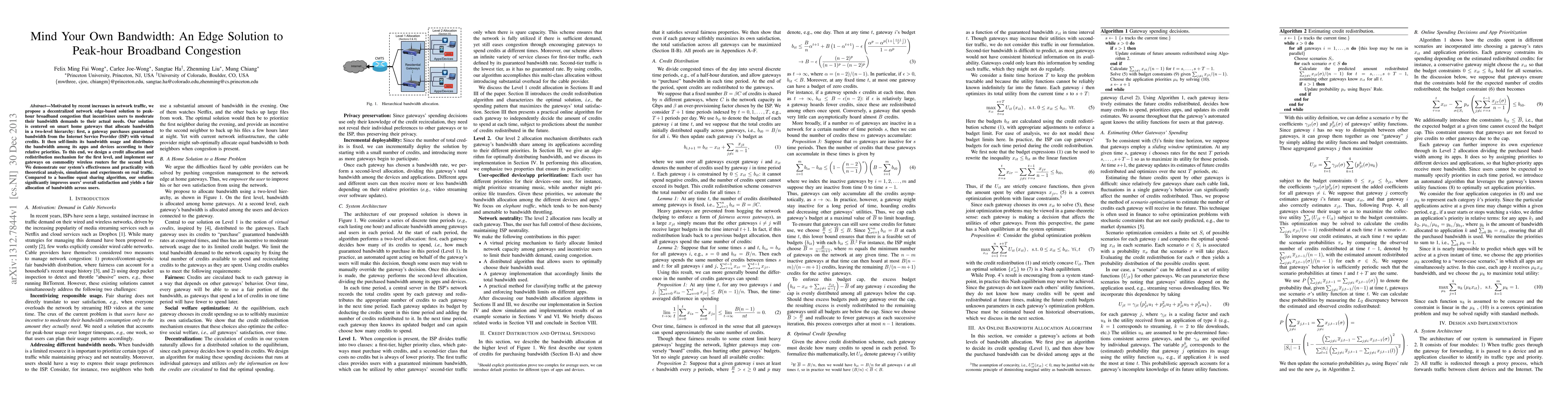 Motivated by recent increases in network traffic, we propose a decentralized network edge-based solution to peak-hour broadband congestion that incentivizes users to moderate their bandwidth demands to their actual needs. Our solution is centered on smart home gateways that allocate bandwidth in a two-level hierarchy: first, a gateway purchases guaranteed bandwidth from the Internet Service Provider (ISP) with virtual credits. It then self-limits its bandwidth usage and distributes the bandwidth among its apps and devices according to their relative priorities. To this end, we design a credit allocation and redistribution mechanism for the first level, and implement our gateways on commodity wireless routers for the second level. We demonstrate our system's effectiveness and practicality with theoretical analysis, simulations and experiments on real traffic. Compared to a baseline equal sharing algorithm, our solution significantly improves users' overall satisfaction and yields a fair allocation of bandwidth across users.