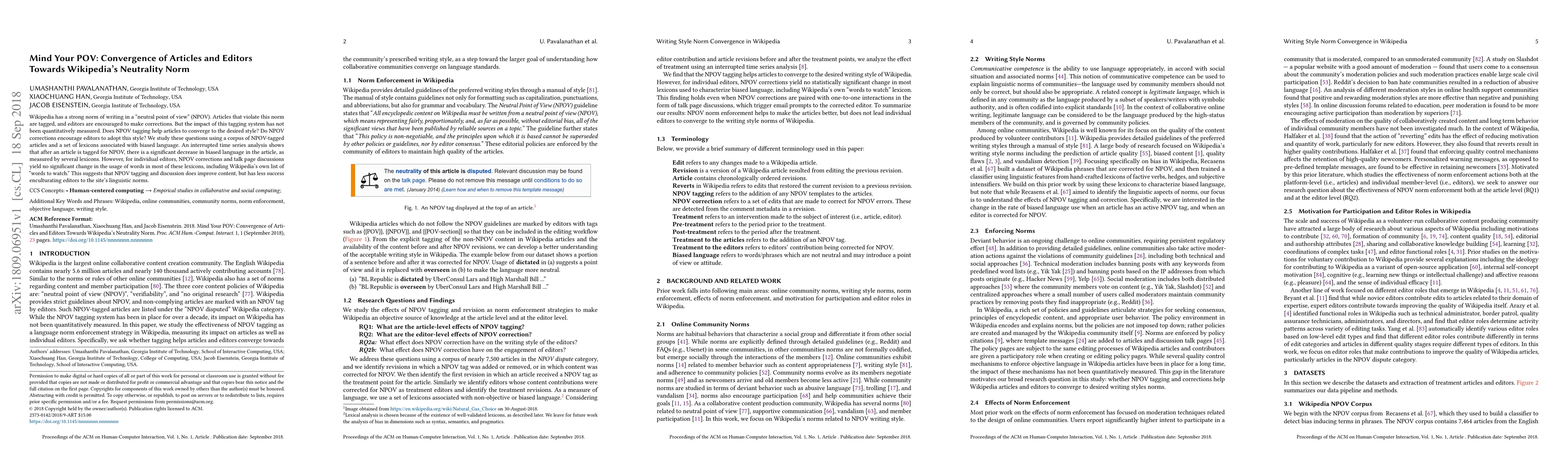 Wikipedia has a strong norm of writing in a 'neutral point of view' (NPOV). Articles that violate this norm are tagged, and editors are encouraged to make corrections. But the impact of this tagging system has not been quantitatively measured. Does NPOV tagging help articles to converge to the desired style? Do NPOV corrections encourage editors to adopt this style? We study these questions using a corpus of NPOV-tagged articles and a set of lexicons associated with biased language. An interrupted time series analysis shows that after an article is tagged for NPOV, there is a significant decrease in biased language in the article, as measured by several lexicons. However, for individual editors, NPOV corrections and talk page discussions yield no significant change in the usage of words in most of these lexicons, including Wikipedia's own list of 'words to watch.' This suggests that NPOV tagging and discussion does improve content, but has less success enculturating editors to the site's linguistic norms.