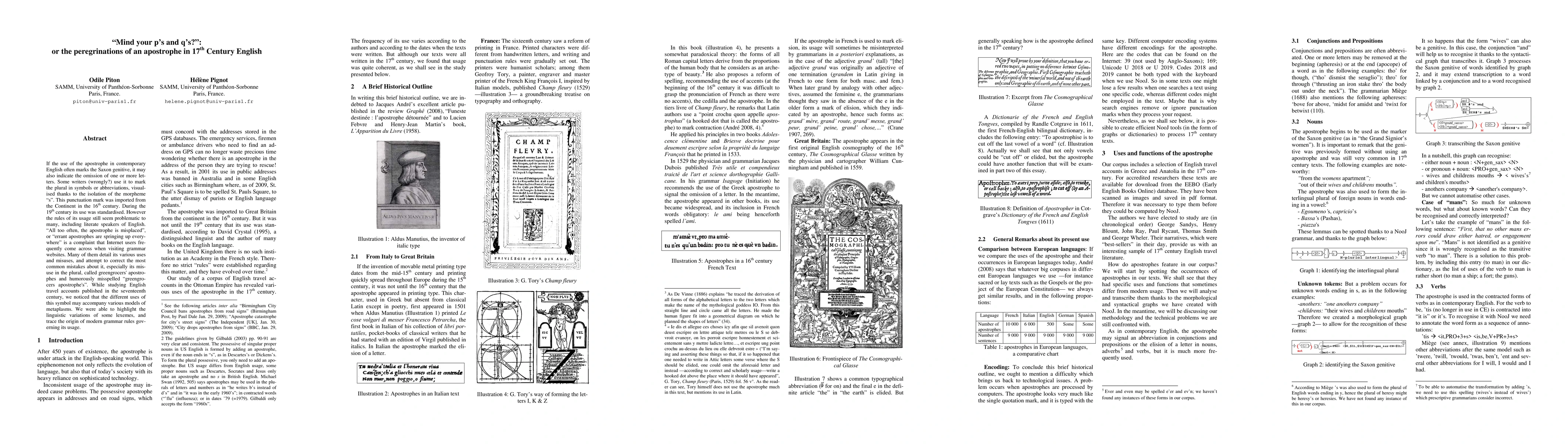 If the use of the apostrophe in contemporary English often marks the Saxon genitive, it may also indicate the omission of one or more let-ters. Some writers (wrongly?) use it to mark the plural in symbols or abbreviations, visual-ised thanks to the isolation of the morpheme "s". This punctuation mark was imported from the Continent in the 16th century. During the 19th century its use was standardised. However the rules of its usage still seem problematic to many, including literate speakers of English. "All too often, the apostrophe is misplaced", or "errant apostrophes are springing up every-where" is a complaint that Internet users fre-quently come across when visiting grammar websites. Many of them detail its various uses and misuses, and attempt to correct the most common mistakes about it, especially its mis-use in the plural, called greengrocers' apostro-phes and humorously misspelled "greengro-cers apostrophe's". While studying English travel accounts published in the seventeenth century, we noticed that the different uses of this symbol may accompany various models of metaplasms. We were able to highlight the linguistic variations of some lexemes, and trace the origin of modern grammar rules gov-erning its usage.