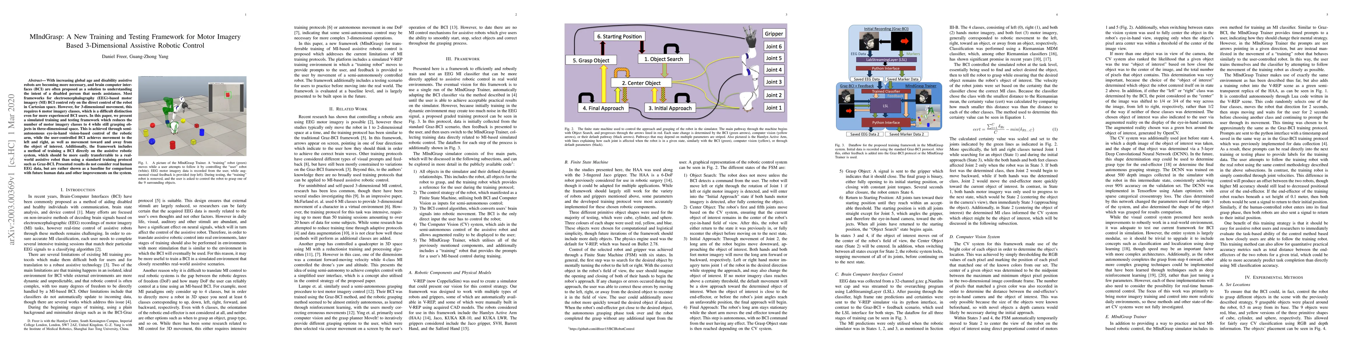 The paper introduces MIndGrasp, a novel training and testing framework for controlling 3D assistive robots using motor imagery and brain-computer interfaces (BCI). It reduces the required motor imagery classes from six to four, simplifying control for users, and includes semi-autonomous vision-based control to enhance the BCI's effectiveness.