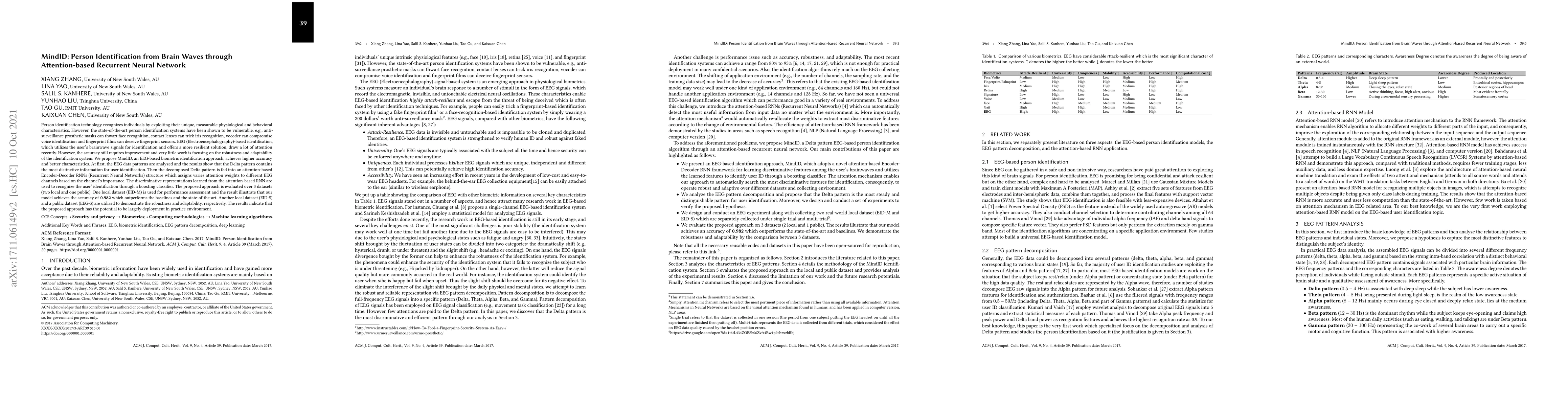 Person identification technology recognizes individuals by exploiting their unique, measurable physiological and behavioral characteristics. However, the state-of-the-art person identification systems have been shown to be vulnerable, e.g., contact lenses can trick iris recognition and fingerprint films can deceive fingerprint sensors. EEG (Electroencephalography)-based identification, which utilizes the users' brainwave signals for identification and offers a more resilient solution, draw a lot of attention recently. However, the accuracy still requires improvement and very little work is focusing on the robustness and adaptability of the identification system. We propose MindID, an EEG-based biometric identification approach, achieves higher accuracy and better characteristics. At first, the EEG data patterns are analyzed and the results show that the Delta pattern contains the most distinctive information for user identification. Then the decomposed Delta pattern is fed into an attention-based Encoder-Decoder RNNs (Recurrent Neural Networks) structure which assigns various attention weights to different EEG channels based on the importance of channels. The discriminative representations learned from the attention-based RNN are used to recognize the user identification through a boosting classifier. The proposed approach is evaluated over 3 datasets (two local and one public). One local dataset (EID-M) is used for performance assessment and the result illustrates that our model achieves an accuracy of 0.982 which outperforms the baselines and the state-of-the-art. Another local dataset (EID-S) and a public dataset (EEG-S) are utilized to demonstrate the robustness and adaptability, respectively. The results indicate that the proposed approach has the potential to be largely deployed in the practice environment.