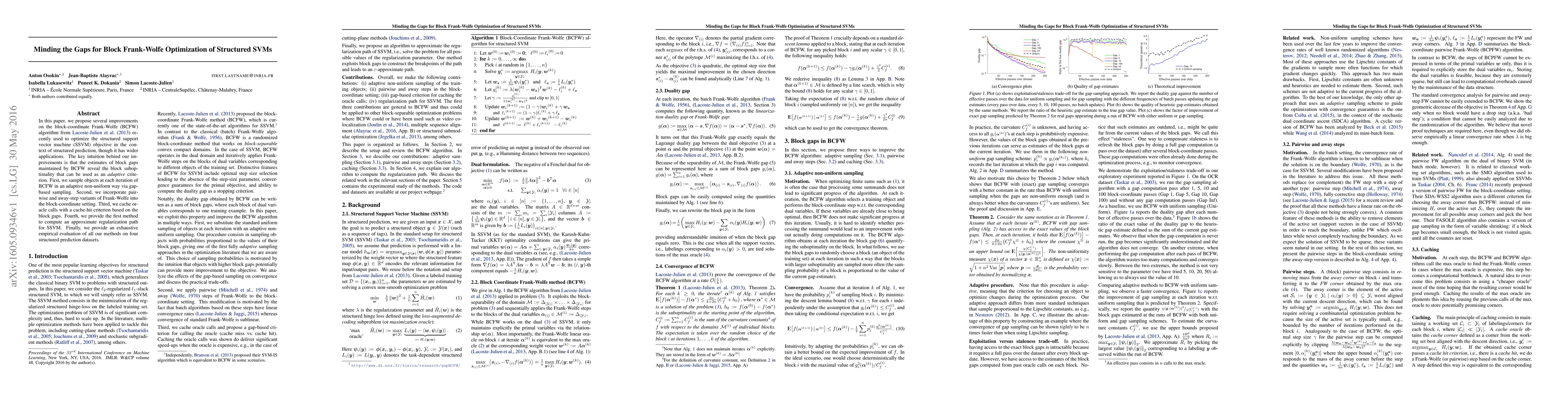 In this paper, we propose several improvements on the block-coordinate Frank-Wolfe (BCFW) algorithm from Lacoste-Julien et al. (2013) recently used to optimize the structured support vector machine (SSVM) objective in the context of structured prediction, though it has wider applications. The key intuition behind our improvements is that the estimates of block gaps maintained by BCFW reveal the block suboptimality that can be used as an adaptive criterion. First, we sample objects at each iteration of BCFW in an adaptive non-uniform way via gapbased sampling. Second, we incorporate pairwise and away-step variants of Frank-Wolfe into the block-coordinate setting. Third, we cache oracle calls with a cache-hit criterion based on the block gaps. Fourth, we provide the first method to compute an approximate regularization path for SSVM. Finally, we provide an exhaustive empirical evaluation of all our methods on four structured prediction datasets.