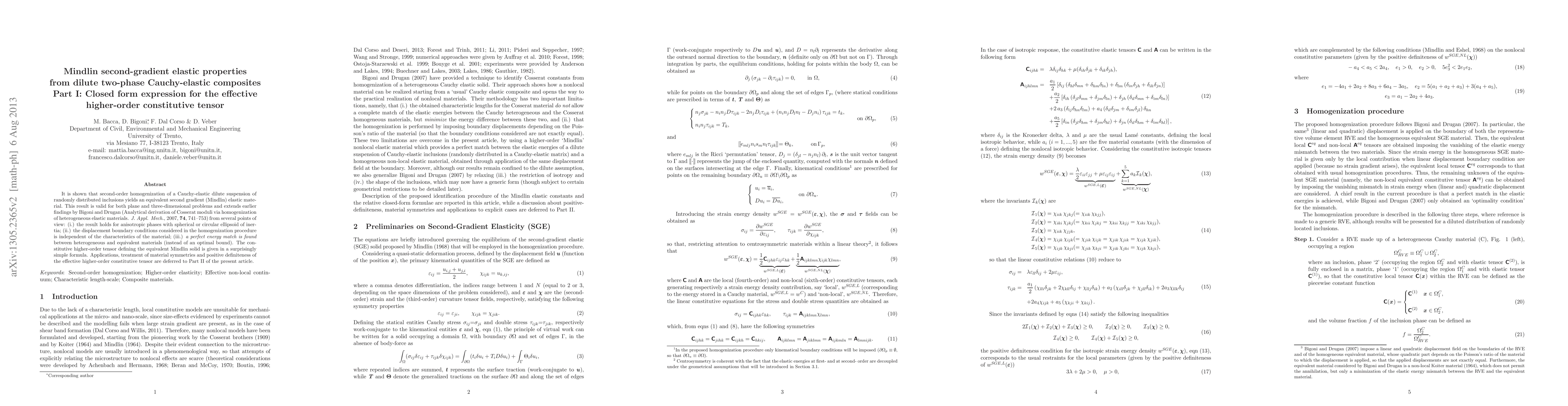 It is shown that second-order homogenization of a Cauchy-elastic dilute suspension of randomly distributed inclusions yields an equivalent second gradient (Mindlin) elastic material. This result is valid for both plane and three-dimensional problems and extends earlier findings by Bigoni and Drugan (Analytical derivation of Cosserat moduli via homogenization of heterogeneous elastic materials. J. Appl. Mech., 2007, 74, 741-753) from several points of view: (i.) the result holds for anisotropic phases with spherical or circular ellipsoid of inertia; (ii.) the displacement boundary conditions considered in the homogenization procedure is independent of the characteristics of the material; (iii.) a perfect energy match is found between heterogeneous and equivalent materials (instead of an optimal bound). The constitutive higher-order tensor defining the equivalent Mindlin solid is given in a surprisingly simple formula. Applications, treatment of material symmetries and positive definiteness of the effective higher-order constitutive tensor are deferred to Part II of the present article.