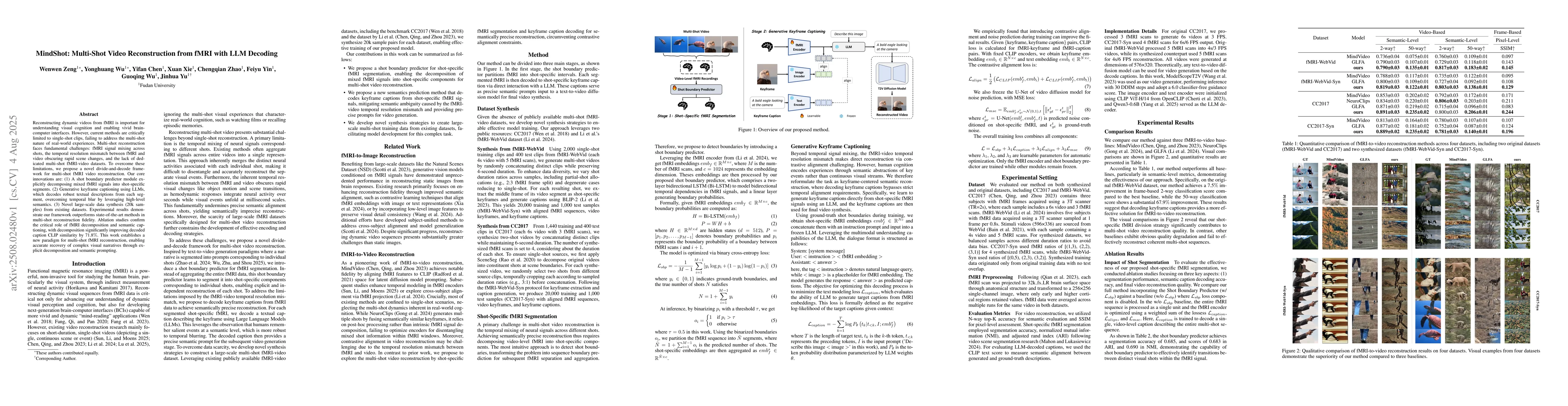 Reconstructing dynamic videos from fMRI is important for understanding visual cognition and enabling vivid brain-computer interfaces. However, current methods are critically limited to single-shot clips, failing to address the multi-shot nature of real-world experiences. Multi-shot reconstruction faces fundamental challenges: fMRI signal mixing across shots, the temporal resolution mismatch between fMRI and video obscuring rapid scene changes, and the lack of dedicated multi-shot fMRI-video datasets. To overcome these limitations, we propose a novel divide-and-decode framework for multi-shot fMRI video reconstruction. Our core innovations are: (1) A shot boundary predictor module explicitly decomposing mixed fMRI signals into shot-specific segments. (2) Generative keyframe captioning using LLMs, which decodes robust textual descriptions from each segment, overcoming temporal blur by leveraging high-level semantics. (3) Novel large-scale data synthesis (20k samples) from existing datasets. Experimental results demonstrate our framework outperforms state-of-the-art methods in multi-shot reconstruction fidelity. Ablation studies confirm the critical role of fMRI decomposition and semantic captioning, with decomposition significantly improving decoded caption CLIP similarity by 71.8%. This work establishes a new paradigm for multi-shot fMRI reconstruction, enabling accurate recovery of complex visual narratives through explicit decomposition and semantic prompting.