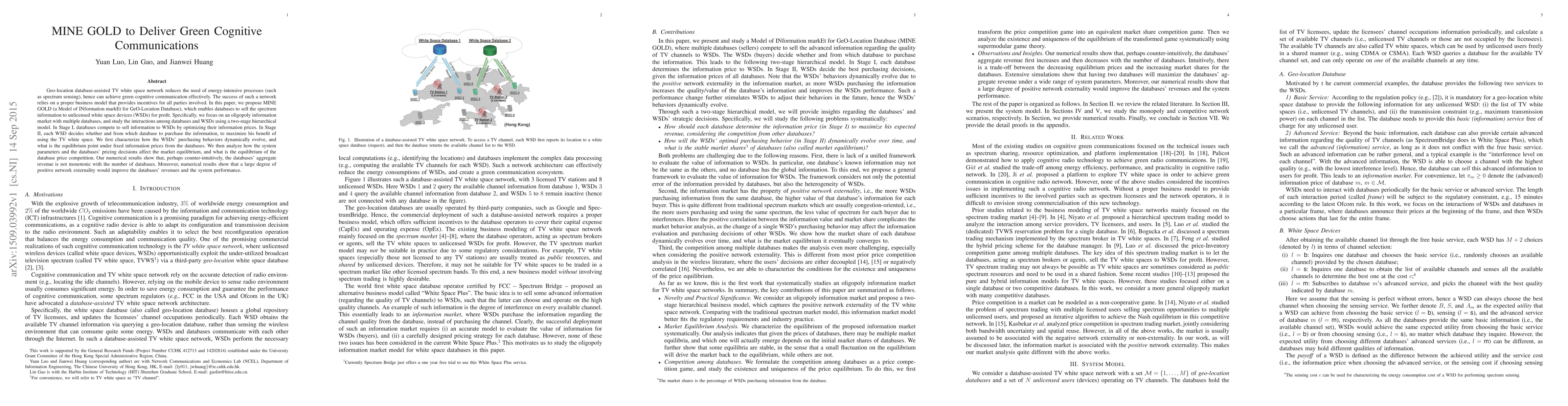 This paper proposes MINE GOLD, a model for an information market where geo-location databases sell spectrum information to unlicensed white space devices, reducing energy-intensive processes and achieving green cognitive communication. The study analyzes interactions in an oligopoly market, showing that databases' aggregate revenue is non-monotonic with their number and that positive network externality enhances revenues and system performance.