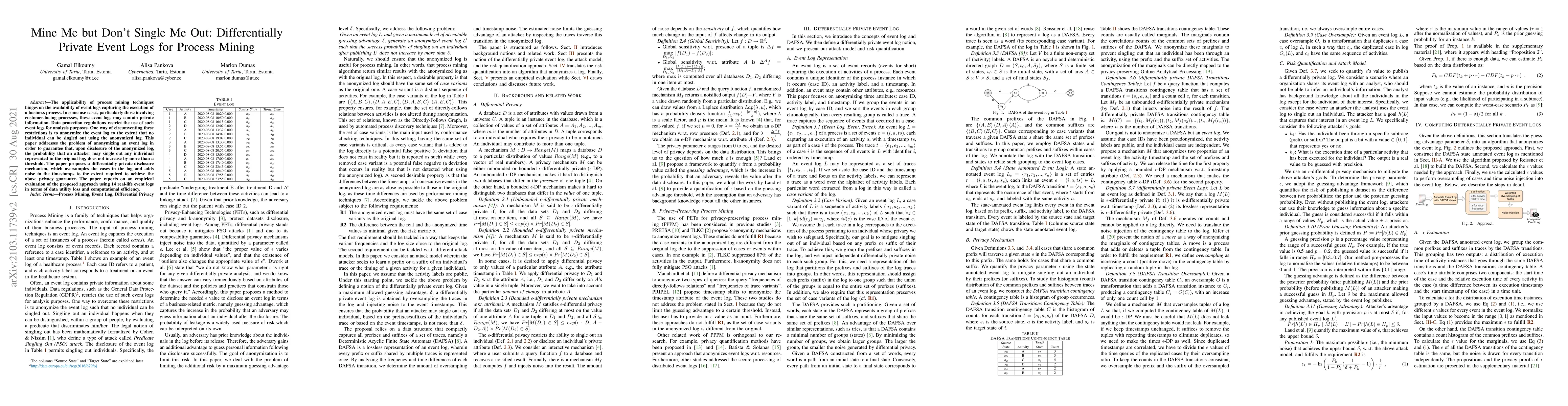 This paper proposes a differentially private method to anonymize event logs for process mining, ensuring that no individual can be singled out while complying with data protection regulations. The approach oversamples cases and adds noise to timestamps, and an empirical evaluation on 14 real-life logs assesses its effectiveness in terms of privacy guarantees and data utility.