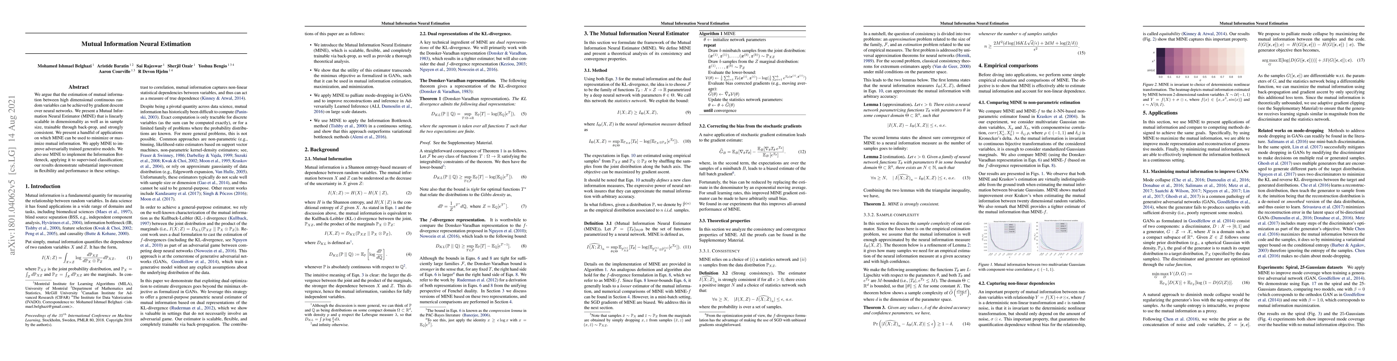 The paper introduces MINE, a Mutual Information Neural Estimator that leverages neural networks to estimate mutual information between high-dimensional continuous variables, demonstrating scalability and strong consistency. It showcases applications in improving generative models and enhancing supervised classification through the Information Bottleneck.