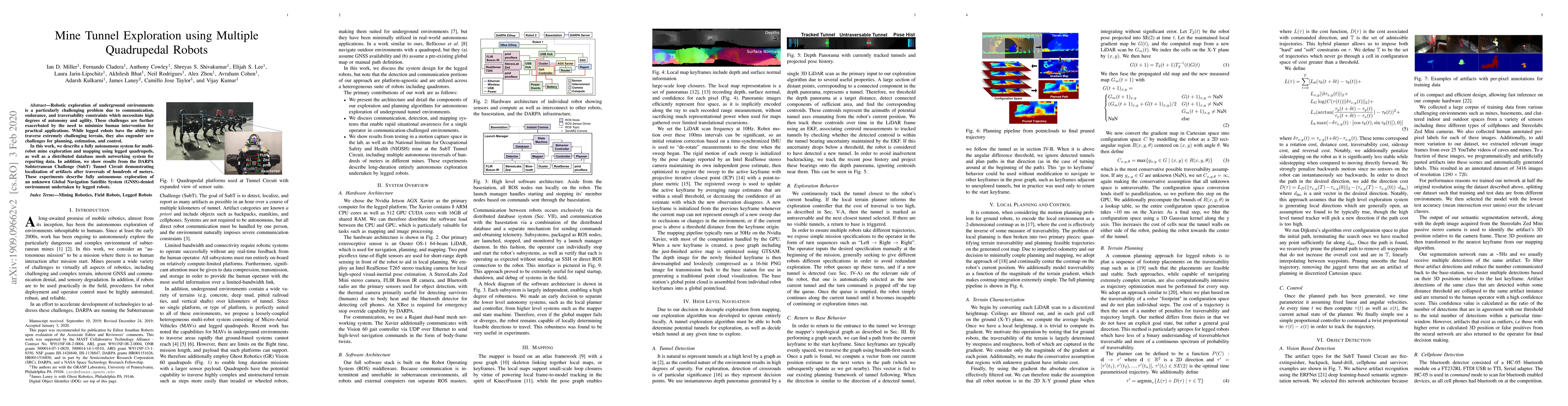 This paper presents a fully autonomous multi-robot system using quadrupedal robots for mine tunnel exploration, addressing challenges like communication and endurance. The system includes a distributed database mesh for data reporting and demonstrated successful artifact localization in the DARPA Subterranean Challenge.