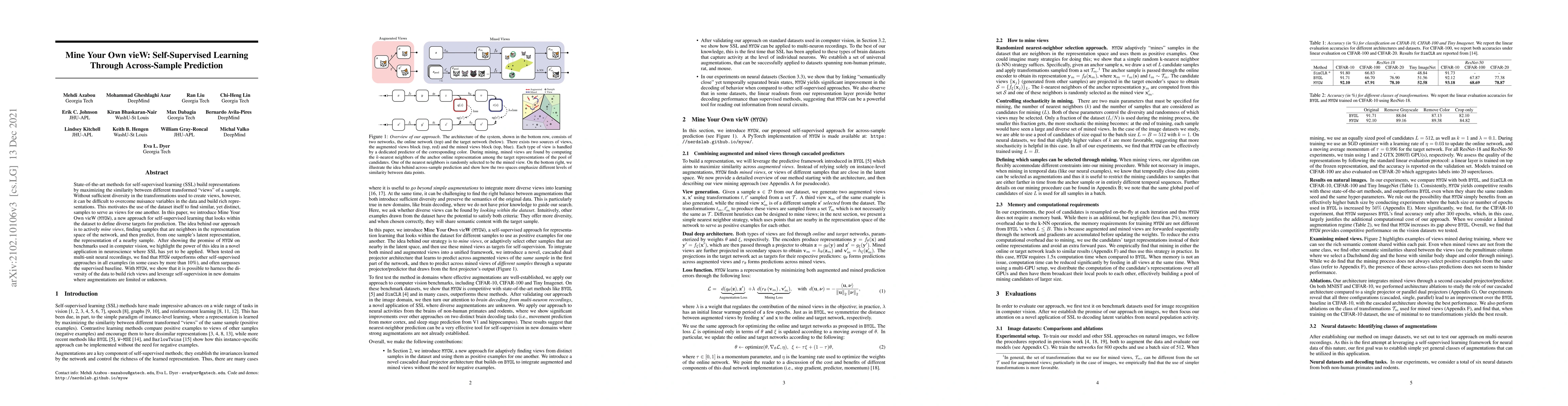 Mine Your Own vieW (MYOW) introduces self-supervised learning by predicting representations of similar yet distinct samples within the dataset, outperforming other methods in computer vision and surpassing supervised baselines in neuroscience applications. This approach leverages the inherent data diversity to create rich representations without relying on external augmentations.