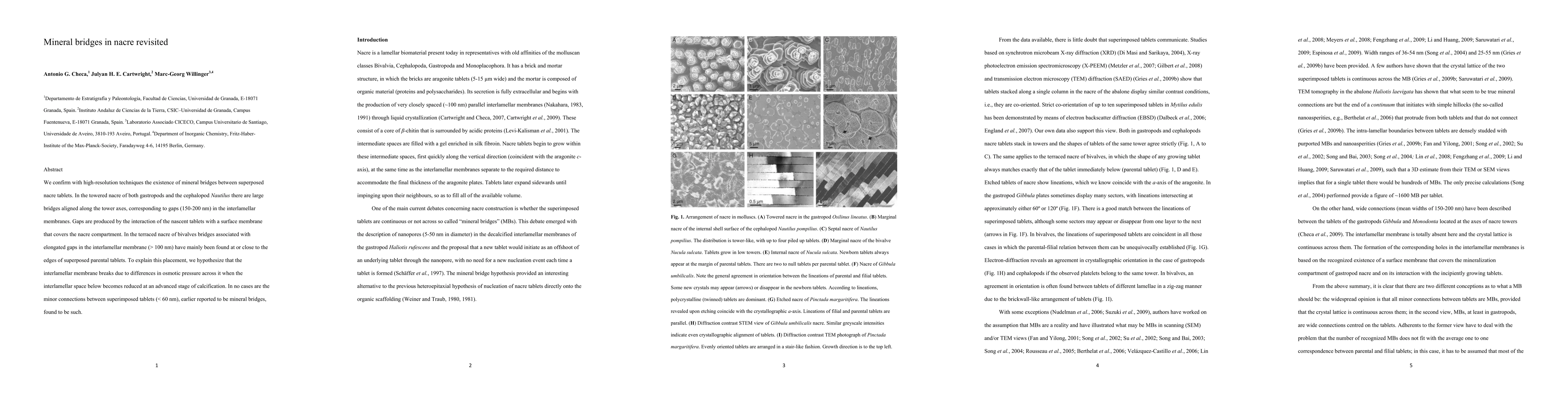 This study confirms the presence of large mineral bridges in the towered nacre of gastropods and Nautilus, aligned along the tower axes, and smaller bridges in bivalves near tablet edges, suggesting osmotic pressure differences cause membrane breaks. Minor connections previously thought to be mineral bridges are not confirmed.