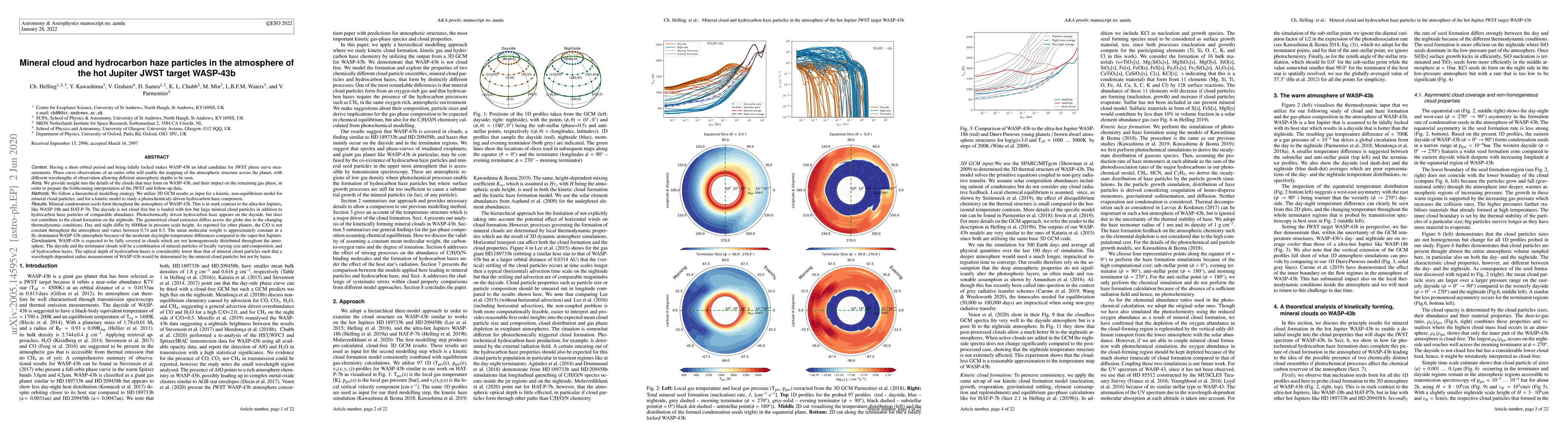 Having a short orbital period and being tidally locked makes WASP-43b an ideal candidate for JWST observations. Phase curve observations of an entire orbit will enable the mapping of the atmospheric structure across the planet, with different wavelengths of observation allowing different atmospheric depths to be seen. We provide insight into the details of the clouds that may form on WASP-43b in order to prepare the forthcoming interpretation of the JWST and follow-up data. We utilize 3D GCM results as input for a kinetic, non-equilibrium model for mineral cloud particles, and for a kinetic model to study a photochemicaly-driven hydrocarbon haze component. Mineral condensation seeds form throughout the atmosphere of WASP-43b. This is in stark contrast to the ultra-hot Jupiters, like WASP-18b and HAT-P-7b. The dayside is loaded with few but large mineral cloud particles in addition to hydrocarbon haze particles of comparable abundance. Photochemically driven hydrocarbon haze appears on the dayside, but does not contribute to the cloud formation on the nightside. The geometrical cloud extension differs across the globe due to the changing thermodynamic conditions. Day and night differ by 6000km in pressure scale height. As reported for other planets, the C/O is not constant throughout the atmosphere. The mean molecular weight is approximately constant in a H2-dominated WASP-43b. WASP-43b is expected to be fully covered in clouds which are not homogeneously distributed throughout the atmosphere. The dayside and the terminator clouds will be a combination of mineral particles of locally varying size and composition, and of hydrocarbon hazes. The optical depth of hydrocarbon hazes is considerably lower than that of mineral cloud particles such that a wavelength-dependent radius measurement of WASP-43b would be determined by the mineral cloud particles but not by hazes.
