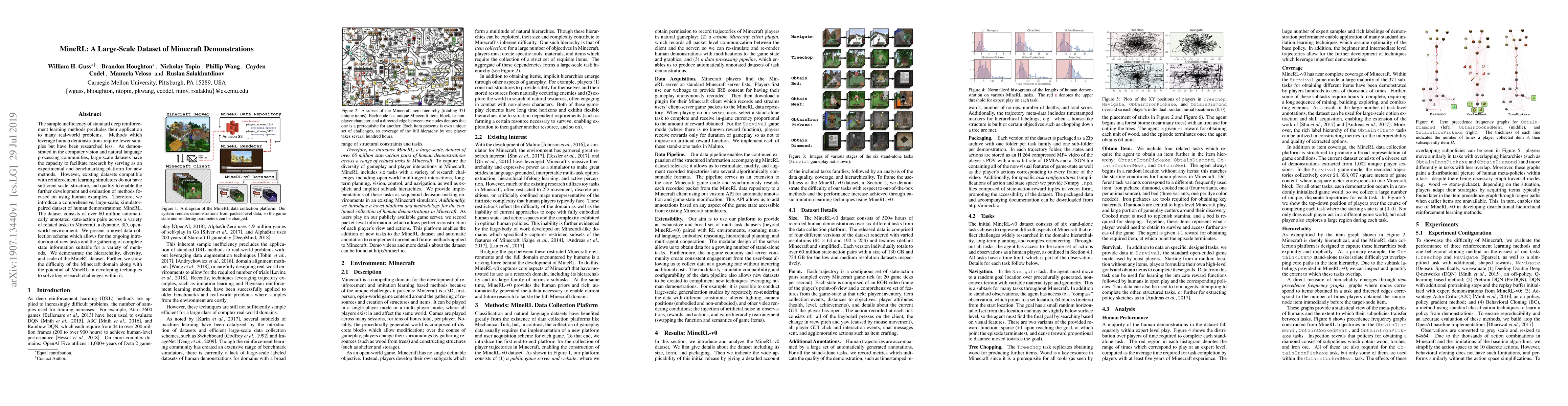 This paper introduces MineRL, a large-scale dataset of over 60 million state-action pairs from human demonstrations in Minecraft. It offers a comprehensive resource for developing and testing reinforcement learning methods using human examples, addressing sample inefficiency in RL and providing a benchmark for future research in this domain.