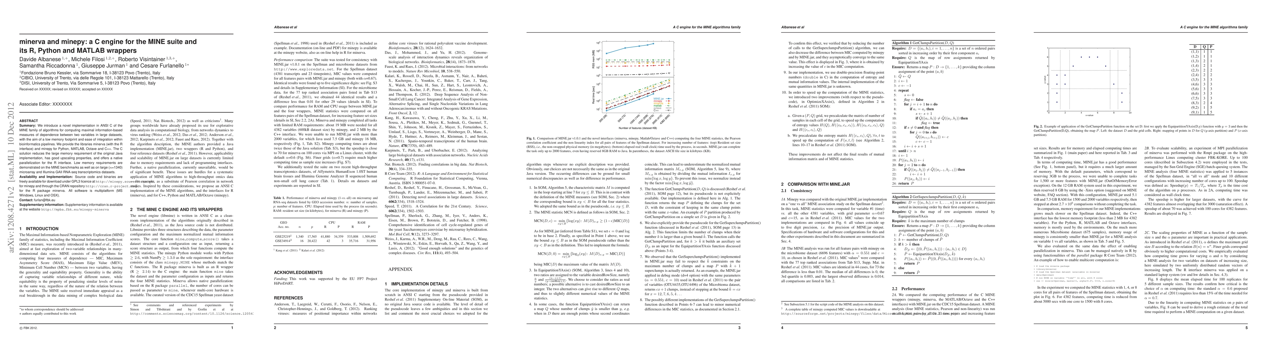 This paper introduces a C implementation of the MINE algorithms for measuring variable dependence, offering lower memory usage and better scalability compared to the original Java version. The new C engine, minepy, and its interfaces for R, Python, MATLAB, Octave, and C++ are designed for efficient integration into bioinformatics workflows.
