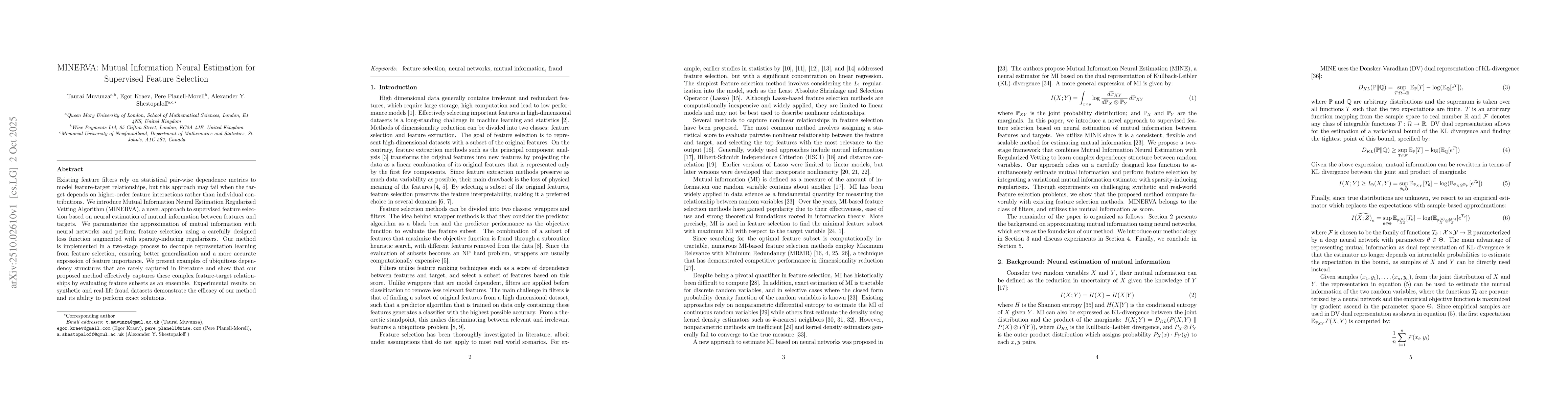 Existing feature filters rely on statistical pair-wise dependence metrics to model feature-target relationships, but this approach may fail when the target depends on higher-order feature interactions rather than individual contributions. We introduce Mutual Information Neural Estimation Regularized Vetting Algorithm (MINERVA), a novel approach to supervised feature selection based on neural estimation of mutual information between features and targets. We paramaterize the approximation of mutual information with neural networks and perform feature selection using a carefully designed loss function augmented with sparsity-inducing regularizers. Our method is implemented in a two-stage process to decouple representation learning from feature selection, ensuring better generalization and a more accurate expression of feature importance. We present examples of ubiquitous dependency structures that are rarely captured in literature and show that our proposed method effectively captures these complex feature-target relationships by evaluating feature subsets as an ensemble. Experimental results on synthetic and real-life fraud datasets demonstrate the efficacy of our method and its ability to perform exact solutions.