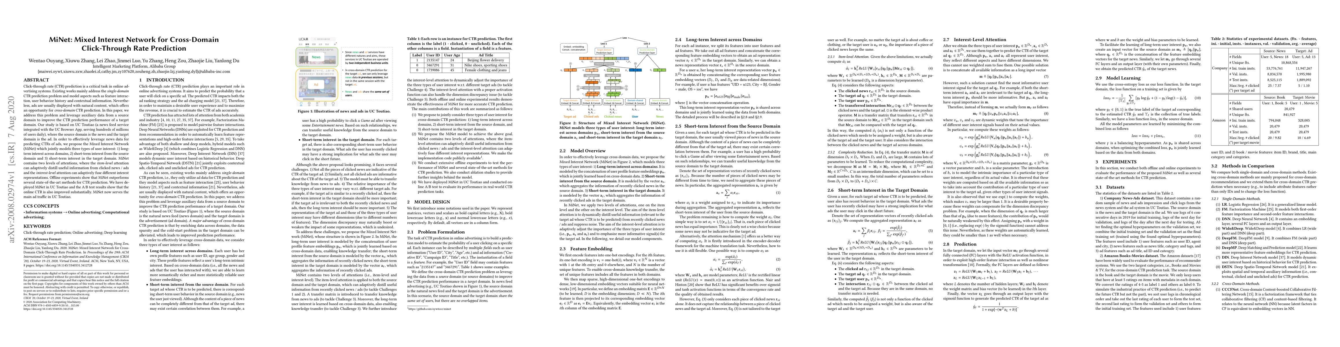 MiNet is proposed to improve cross-domain click-through rate (CTR) prediction by leveraging auxiliary data from a source domain. It models long-term and short-term user interests across domains and demonstrates superior performance both offline and in an online A/B test deployed on UC Toutiao.