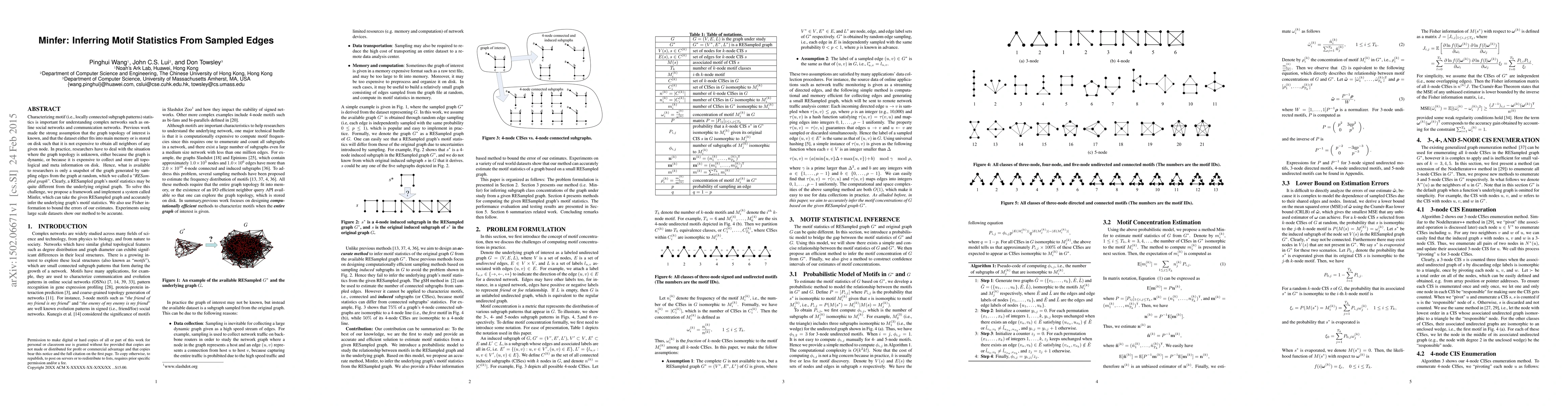 Characterizing motif (i.e., locally connected subgraph patterns) statistics is important for understanding complex networks such as online social networks and communication networks. Previous work made the strong assumption that the graph topology of interest is known, and that the dataset either fits into main memory or stored on disks such that it is not expensive to obtain all neighbors of any given node. In practice, researchers have to deal with the situation where the graph topology is unknown, either because the graph is dynamic, or because it is expensive to collect and store all topological and meta information on disk. Hence, what is available to researchers is only a snapshot of the graph generated by sampling edges from the graph at random, which we called a "RESampled graph". Clearly, a RESampled graph's motif statistics may be quite different from the underlying original graph. To solve this challenge, we propose a framework and implement a system called Minfer, which can take the given RESampled graph and accurately infer the underlying graph's motif statistics. We also use Fisher information to bound the error of our estimates. Experiments using large scale datasets show that our method to be accurate.